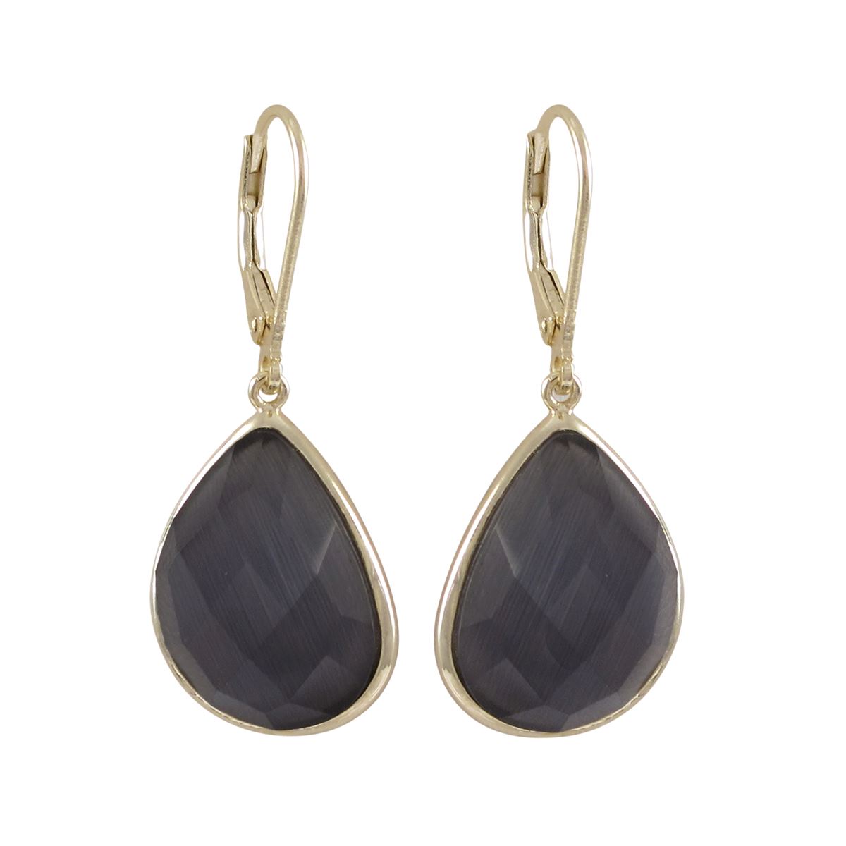 Dark Amy Cat's Eye Semi Precious Faceted Stone On Gold Plated Sterling Silver Lever Back Earrings, 1.44&Quot;