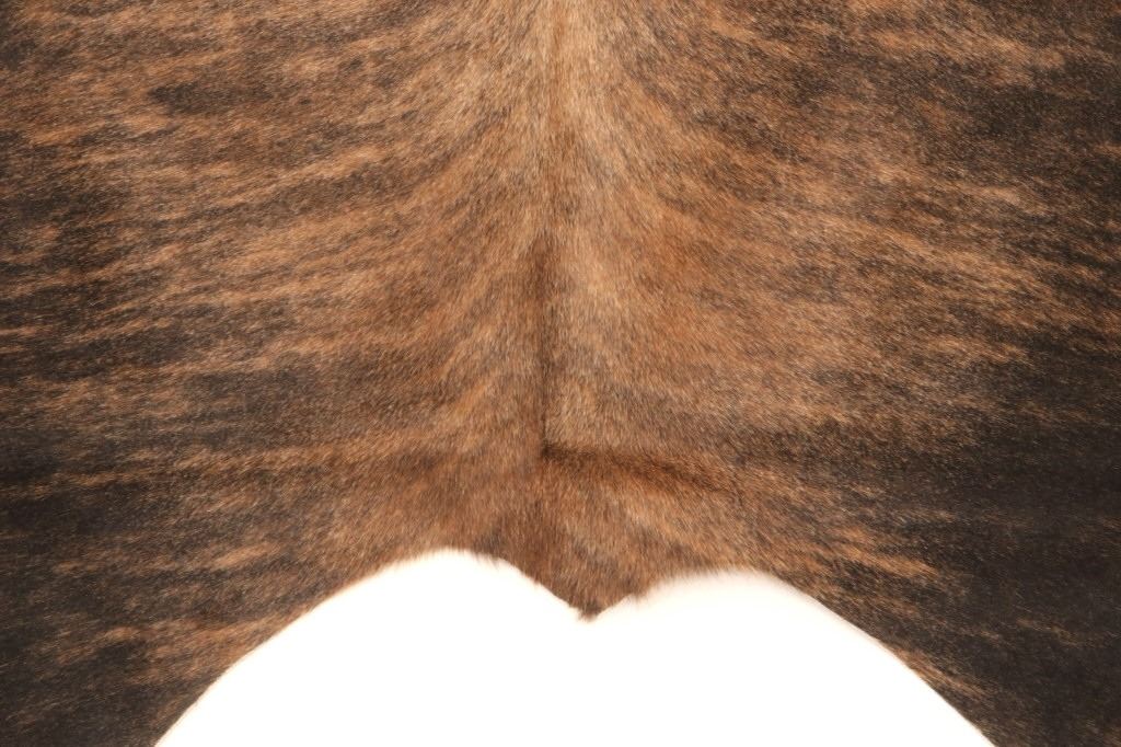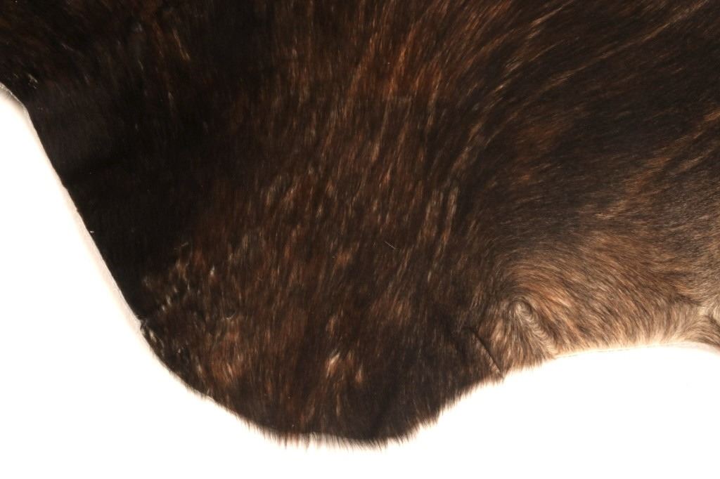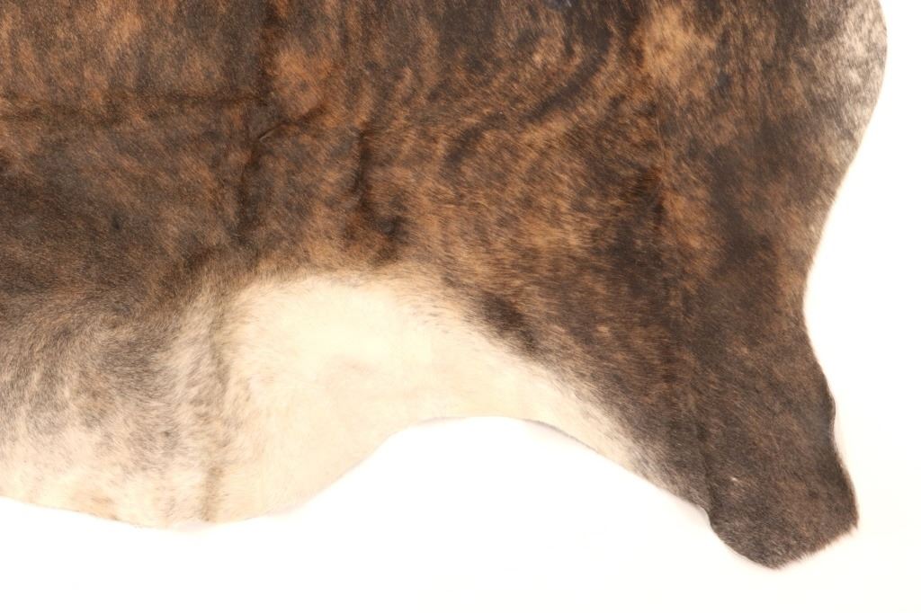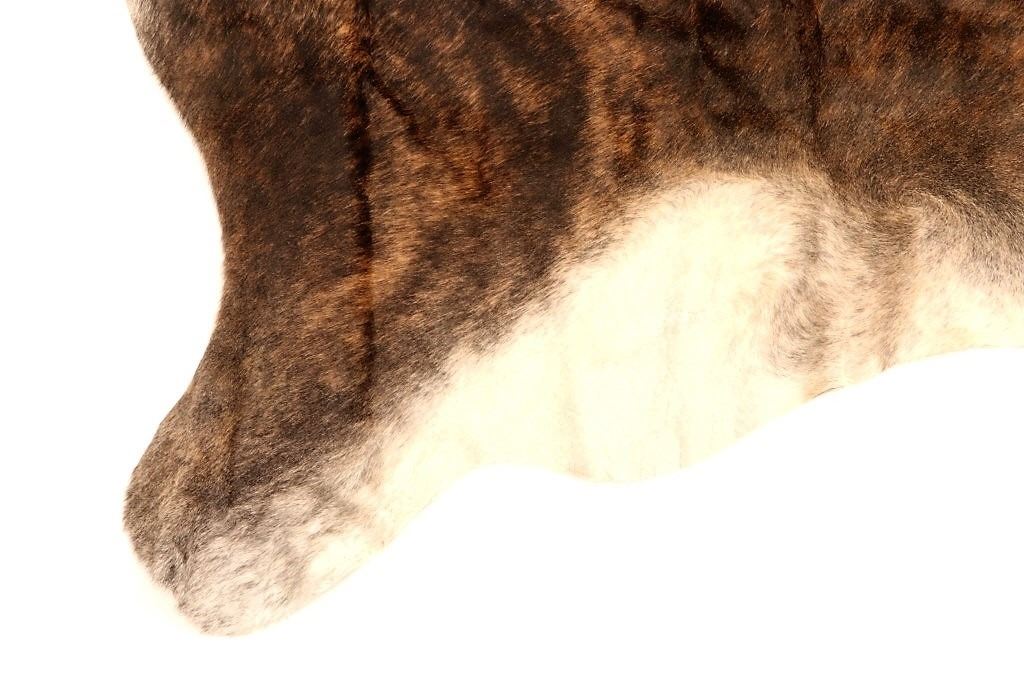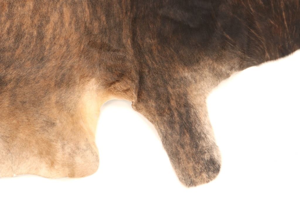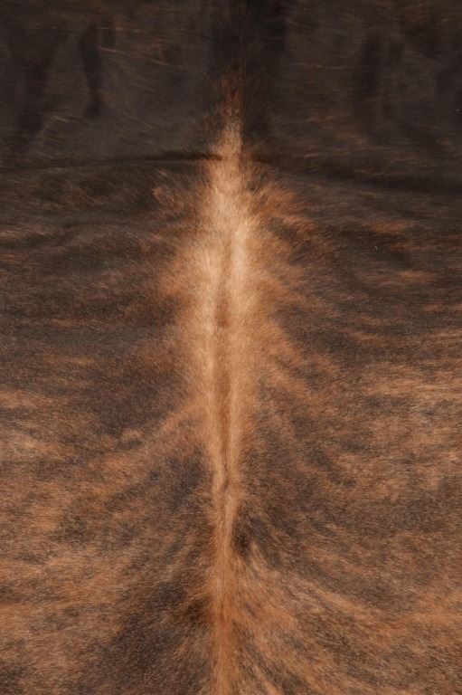This is an excellent, premium cowhide rug with beautiful brindle, dark brown coloring that fades to darker stripes and speckled patterns, giving it a tri-coloration; it is sometimes described as "tiger-striped”, although the brindle pattern is more subtle than that of a tiger's coat. In brindle coloration, the streaks of color are irregular and darker than the base color of the coat, although very dark markings can be seen on a coat that is only slightly lighter. The cowhide (also referred to as cow hide, steer hide, steer hide) is a brand-new example that has been professionally tanned and is in pristine condition. The rug is also considered an Extra-Large (XL) to Extra-Extra-Large (XXL) size, being 6 feet 6 inches long by 8 feet.