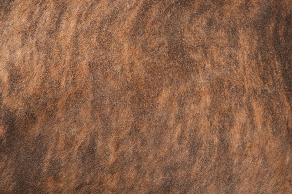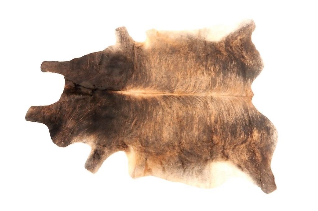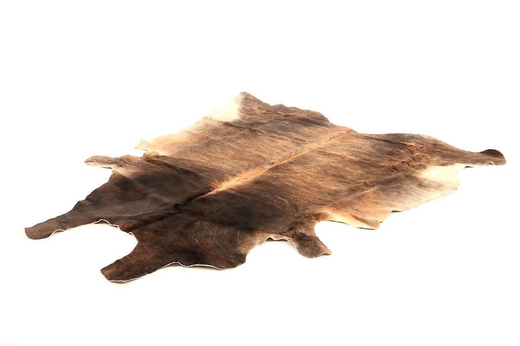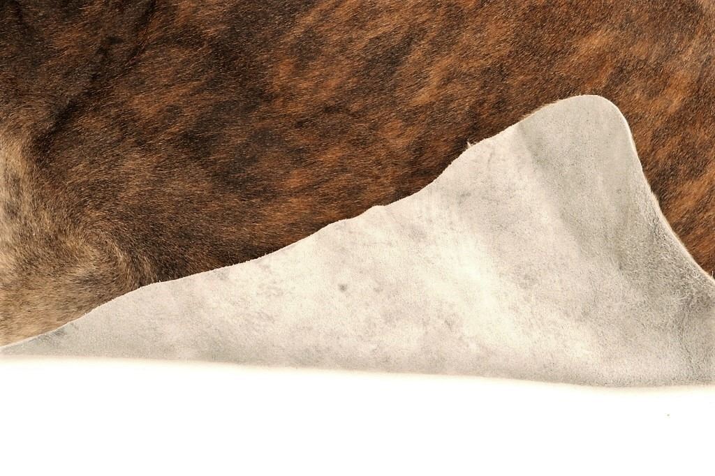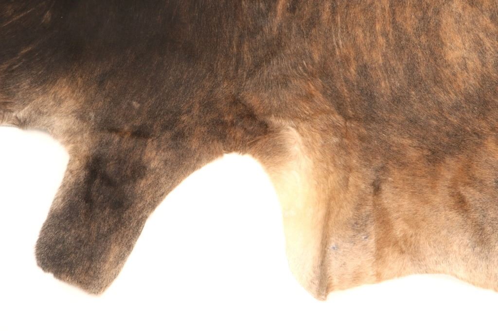 This is an excellent, premium cowhide rug with beautiful brindle, dark brown coloring that fades to darker stripes and speckled patterns, giving it a tri-coloration; it is sometimes described as "tiger-striped”, although the brindle pattern is more subtle than that of a tiger's coat. In brindle coloration, the streaks of color are irregular and darker than the base color of the coat, although very dark markings can be seen on a coat that is only slightly lighter. The cowhide (also referred to as cow hide, steer hide, steer hide) is a brand-new example that has been professionally tanned and is in pristine condition. The rug is also considered an Extra-Large (XL) to Extra-Extra-Large (XXL) size, being 6 feet 6 inches long by 8 feet.