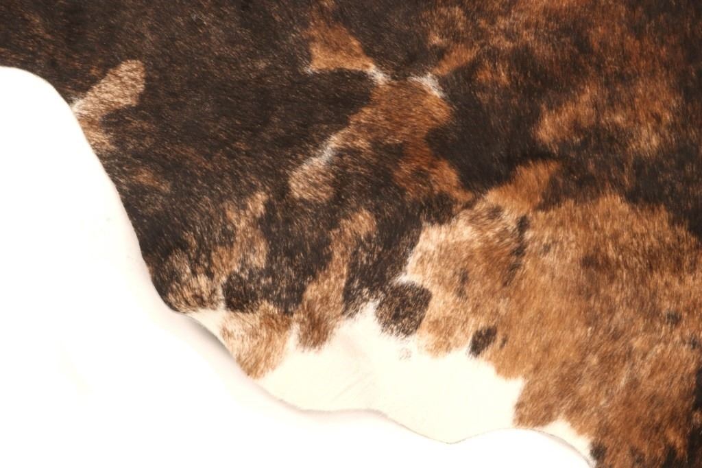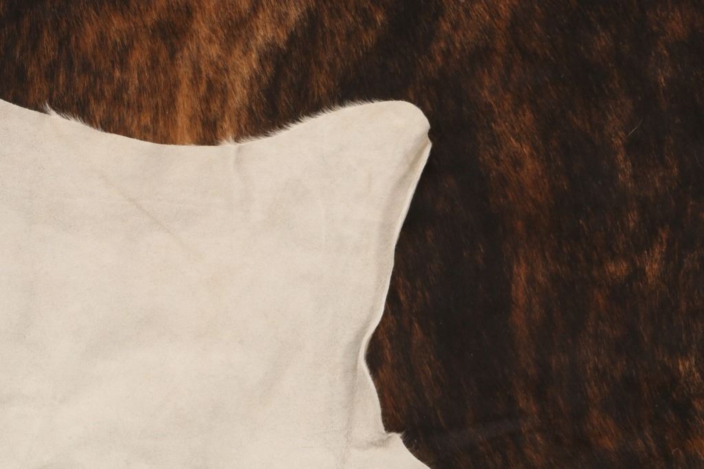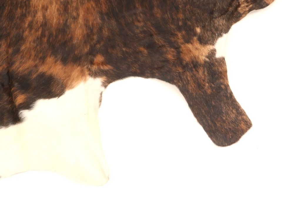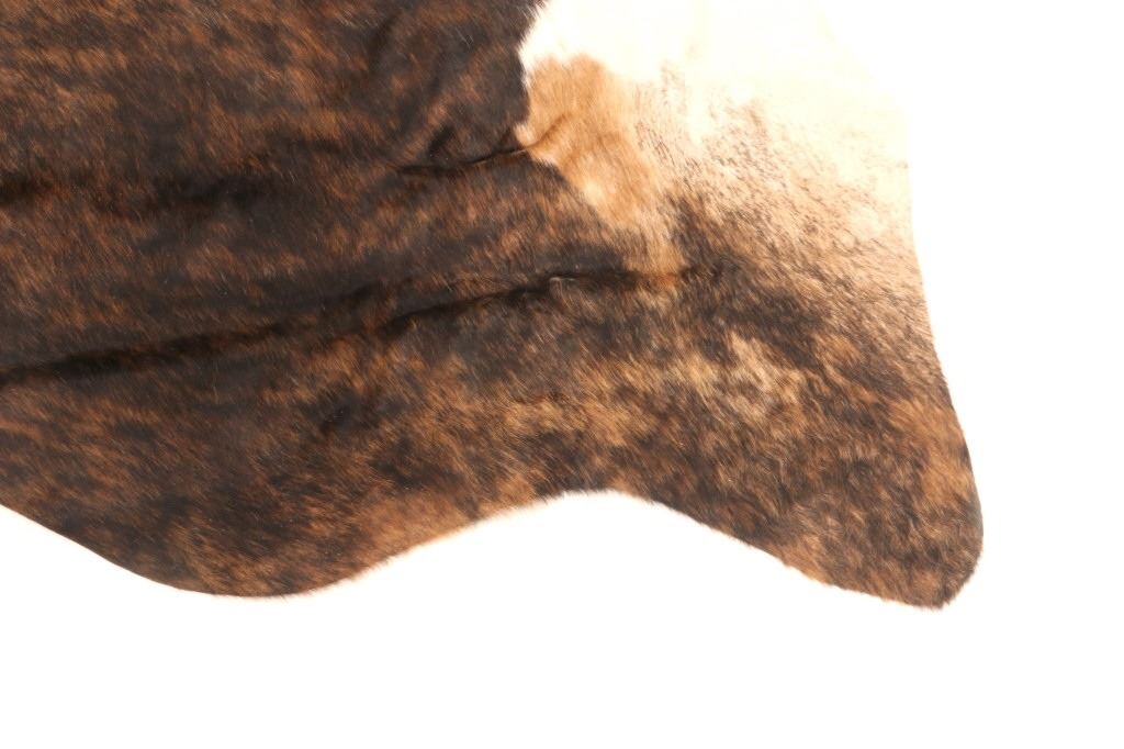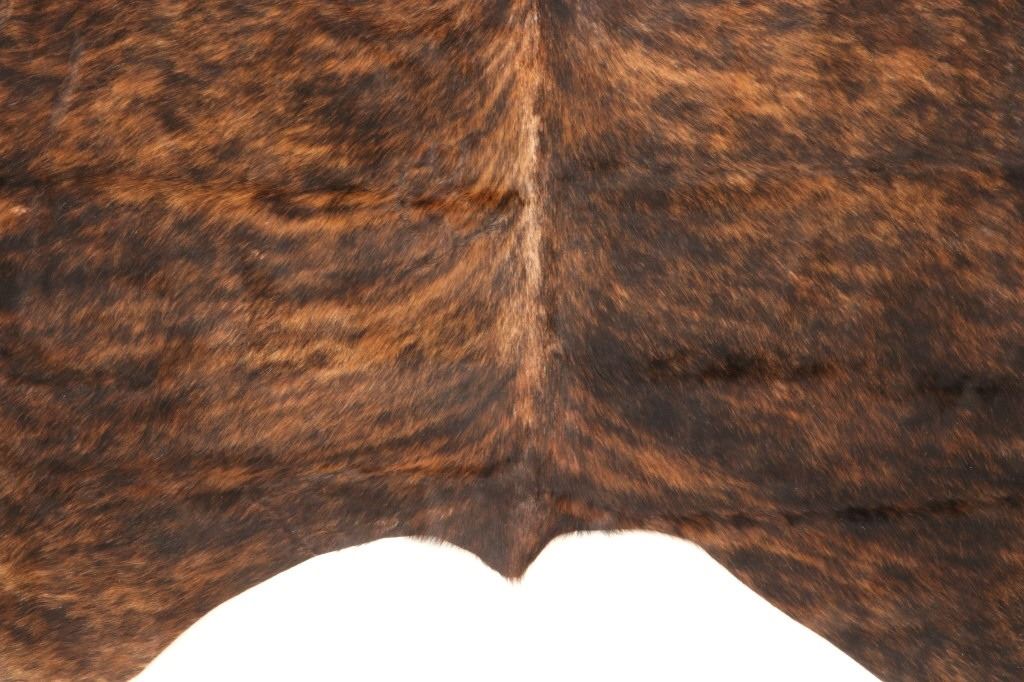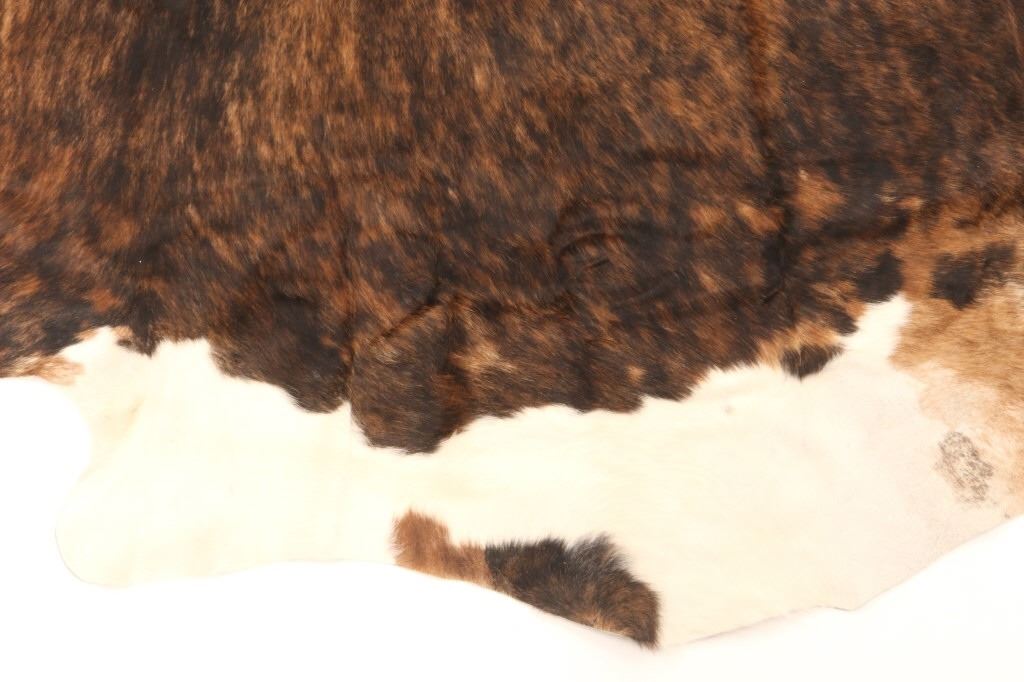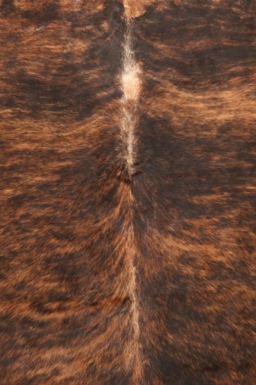 This is an excellent, premium cowhide rug with beautiful brindle, light brown coloring that fades to darker stripes and speckled patterns with white accents; it is sometimes described as "tiger-striped", although the brindle pattern is more subtle than that of a tiger's coat. Brindle coloration shows the streaks of color as irregular and darker than the base color of the coat; although, very dark markings can be seen on a coat that is only slightly lighter. The cowhide (also referred to as cow hide, steer hide, steer hide) is a brand-new example that has been professionally tanned and is in pristine condition. The rug is also considered an Extra-Large (XL) to Extra-Extra-Large (XXL) size, being 8'1" L x 7'1" W.*
