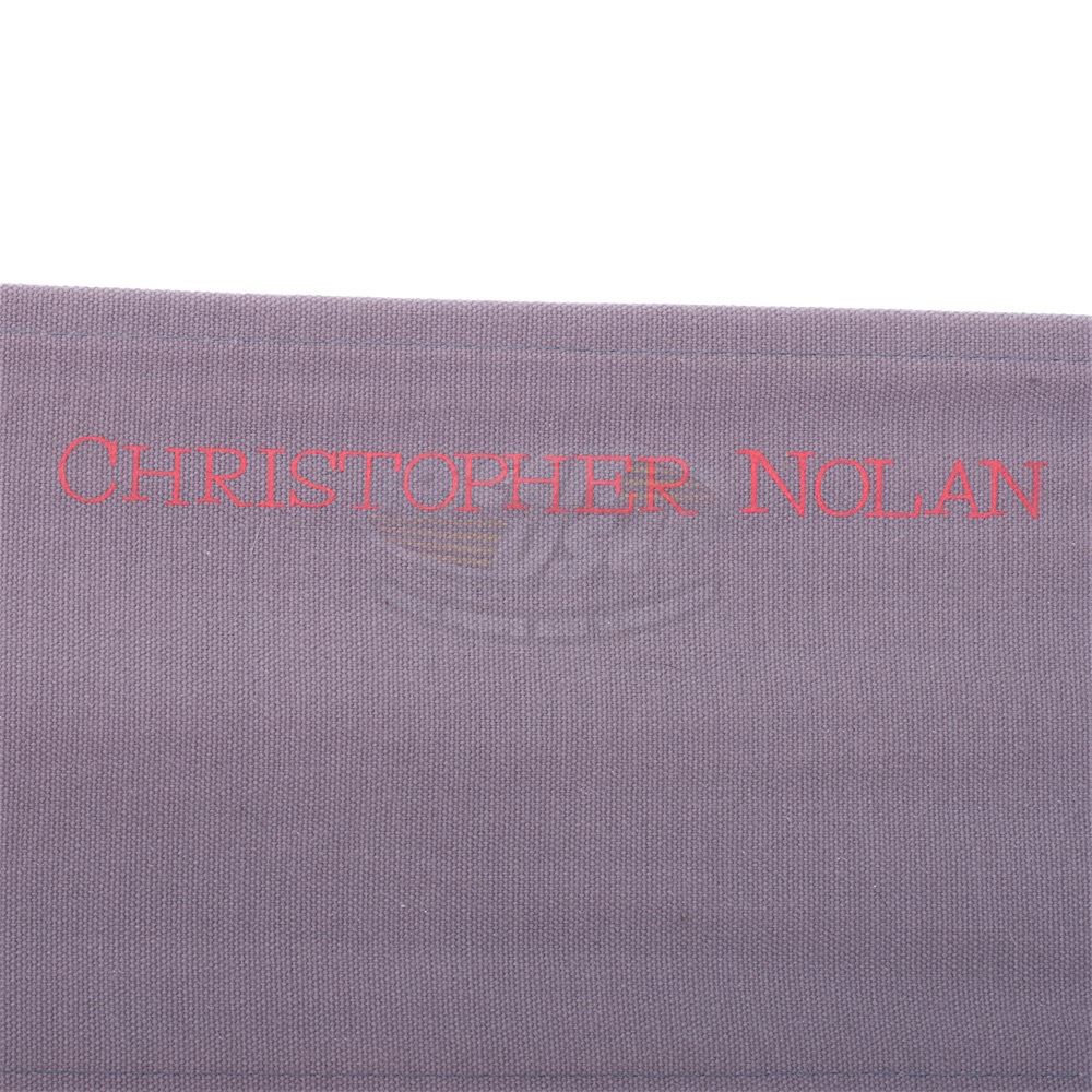 (Warner Bros., 2012) This directors chair was acquired by the production for use by the film's director, Christopher Nolan during filming. The wood frame chair stands 45" tall and features a custom chair back with "Christopher Nolan" on one side and the film's code name "Magnus Rex" on the other side. A script pouch is attached to the right arm rest. Minor wear from use is present.