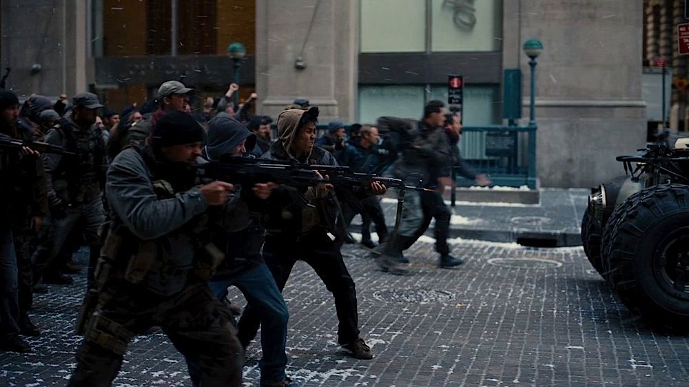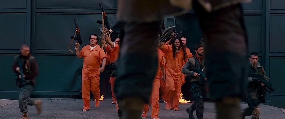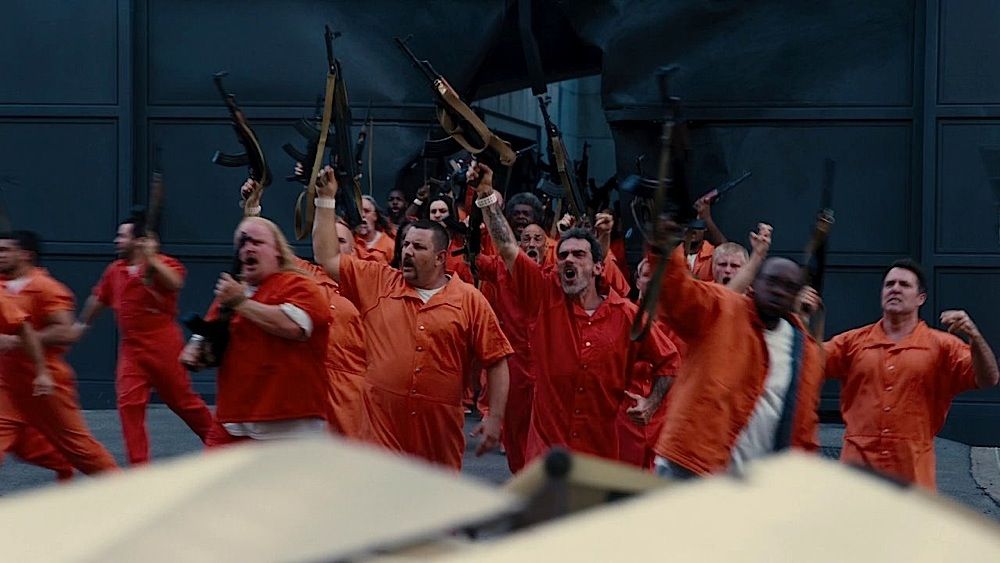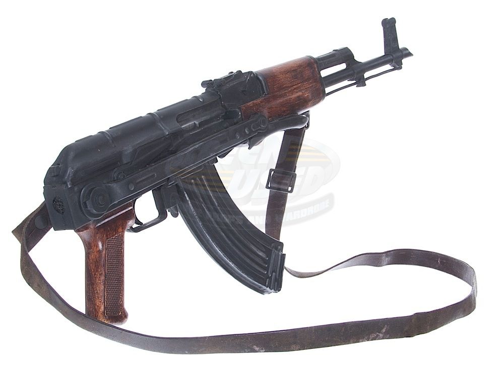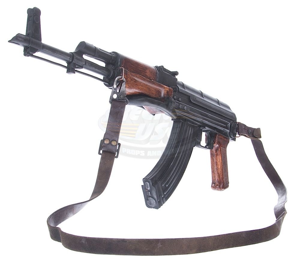 (Warner Bros., 2012) This prop machine gun was custom-made by the production for use by various actors during filming. The gun is made of hard rubber over a metal frame with attached leather shoulder strap and features painted sections to resemble wood. Measures 26" in length. Minor wear from use is present.