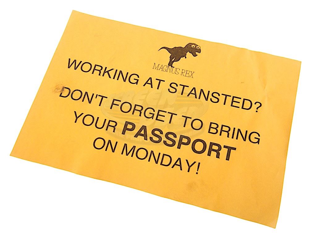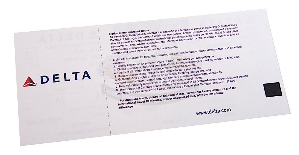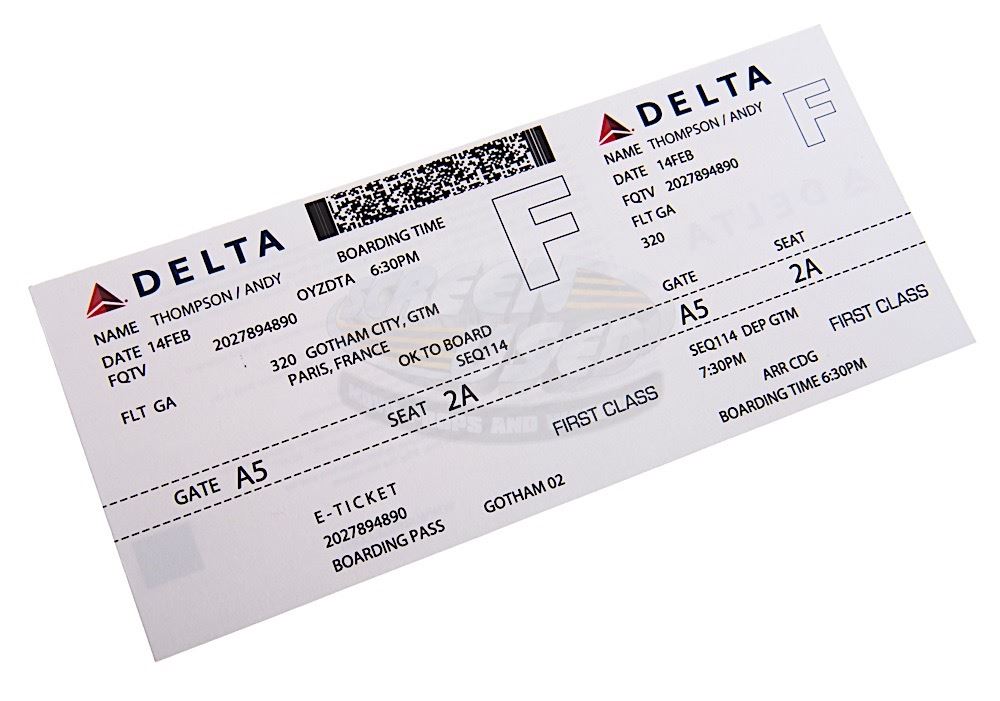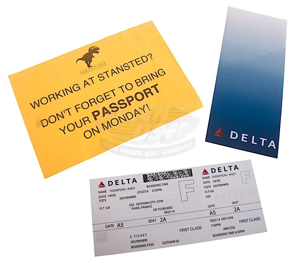 (Warner Bros., 2012) This prop airplane ticket was custom-printed by the production for use by various actors and as set dressing. The ticket features the flight information for a first class one way passage to France from Gotham City with Delta Airlines. The ticket includes a Delta Airlines ticket envelope. Included with the ticket is a printed reminder handed out to the film's crew featuring the film's location code name/logo.