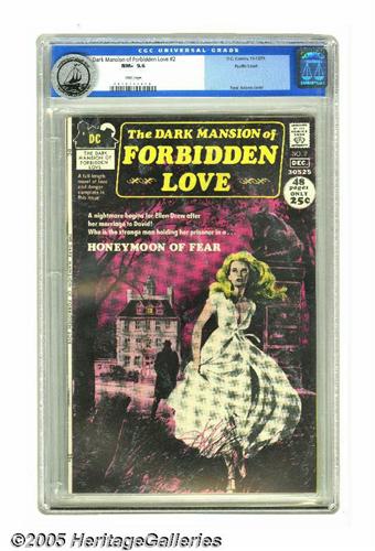 <B>Dark Mansion of Forbidden Love #2 Pacific Coast pedigree (DC, 1971) CGC NM+ 9.6 White pages.</B></I> Cover artist Neal Adams chose grey tone as his medium here, opting for the tried-and-true combination of fleeing woman + shadowy man + house with <I>exactly</B></I> one light on. The two interior features were drawn by Tony DeZuniga and Don Heck. Overstreet 2005 NM- 9.2 value = $100. CGC census 3/05: 2 in 9.6, none higher.