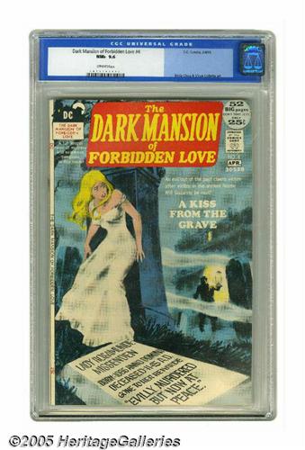 <B>Dark Mansion of Forbidden Love #4 (DC, 1972) CGC NM+ 9.6 Off-white pages.</B></I> Last issue of the title. Nick Cardy cover. Ernie Chan art. Overstreet 2005 NM- 9.2 value = $100. CGC census 1/05: 3 in 9.6, 3 higher. <I>From the collection of Chris Bell.</B></I>