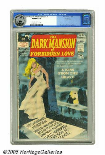 <B>Dark Mansion of Forbidden Love #4 Pacific Coast pedigree (DC, 1972) CGC NM/MT 9.8 Off-white to white pages.</B></I> Nick Cardy drew this hypnotic grey toned cover for the last issue DC's unusual gothic romance series (and as usual, in the background there's a dark house with one room lit up). The interior art is by Ernie Chua (aka Ernie Chan). Overstreet 2005 NM- 9.2 value = $100. CGC census 3/05: 3 in 9.8, none higher.
