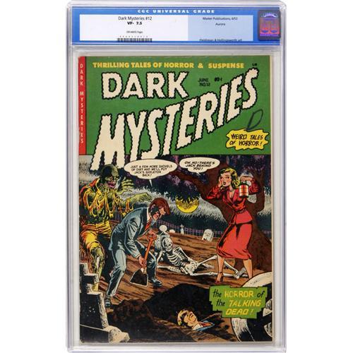 <B>Dark Mysteries #12 Aurora pedigree (Master Publications, 1953) CGC VF- 7.5 Off-white pages.</B></I> Here's another pedigree copy of this title, and this is the first time we've ever offered a copy of this issue. So, we'll call it on the scarce side! Hy Fleishman and A. C. Hollingsworth contributed interior art. Overstreet 2006 VF 8.0 value = $225. CGC census 3/07: 1 in 7.5, 3 higher.<BR><BR><b>Shipping:</b> Comics - Slabbed (certified) (<a target=""_blank"" href=""http://www.heritageauctions.com/common/shipping.php"">view shipping information</a>)