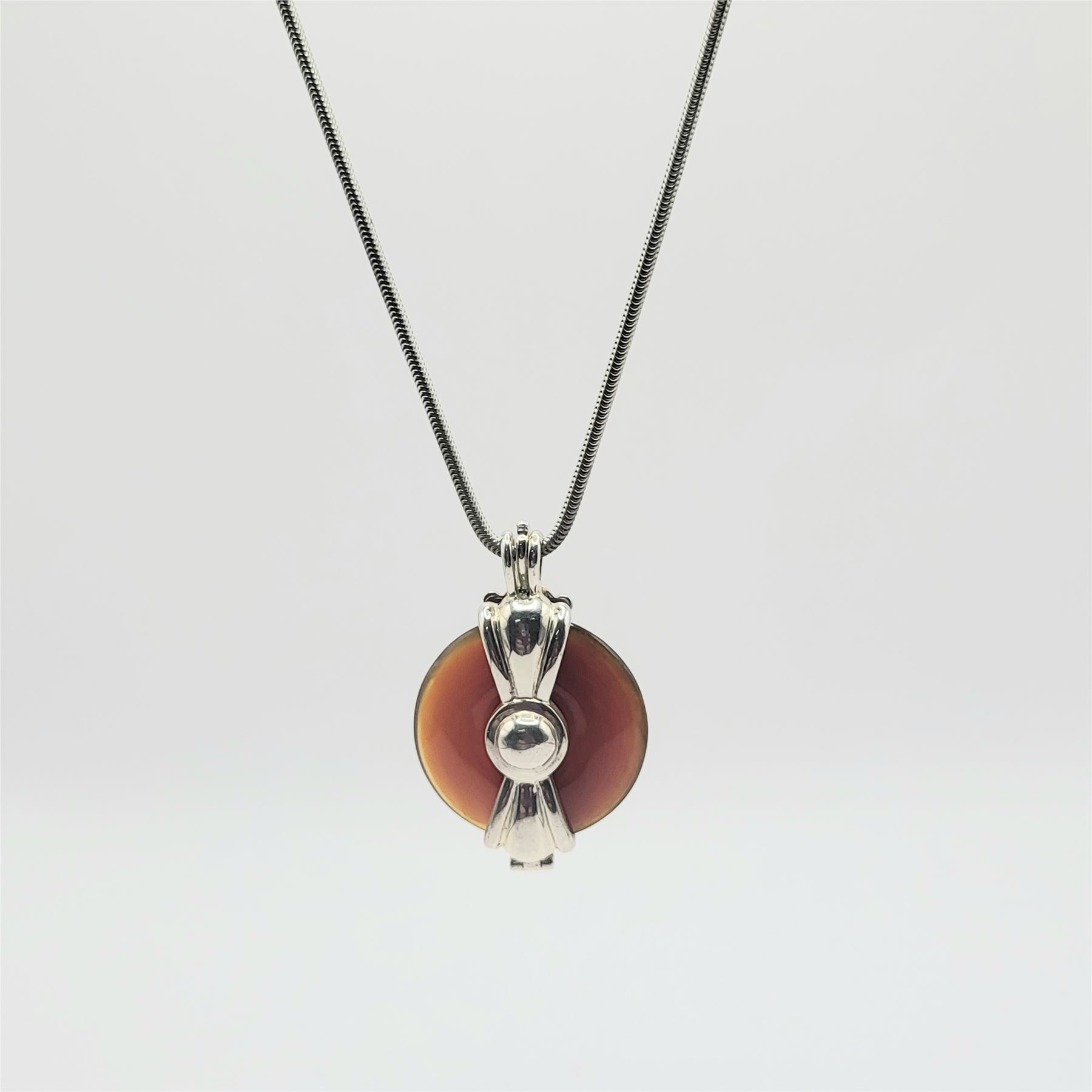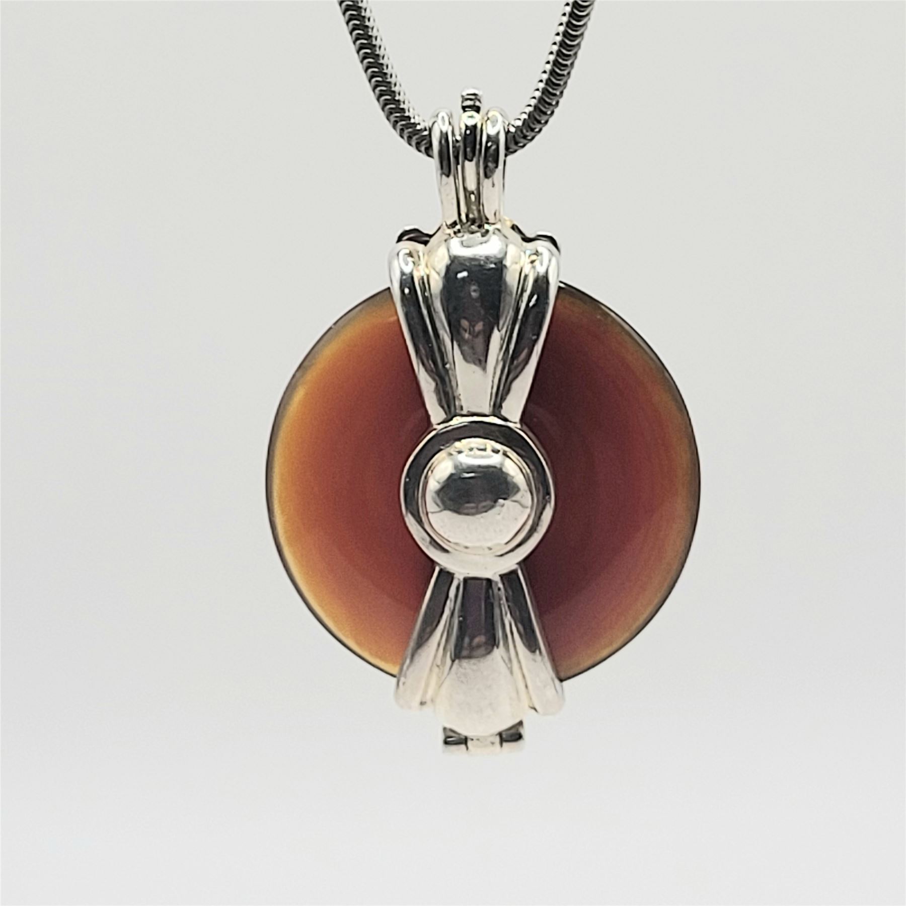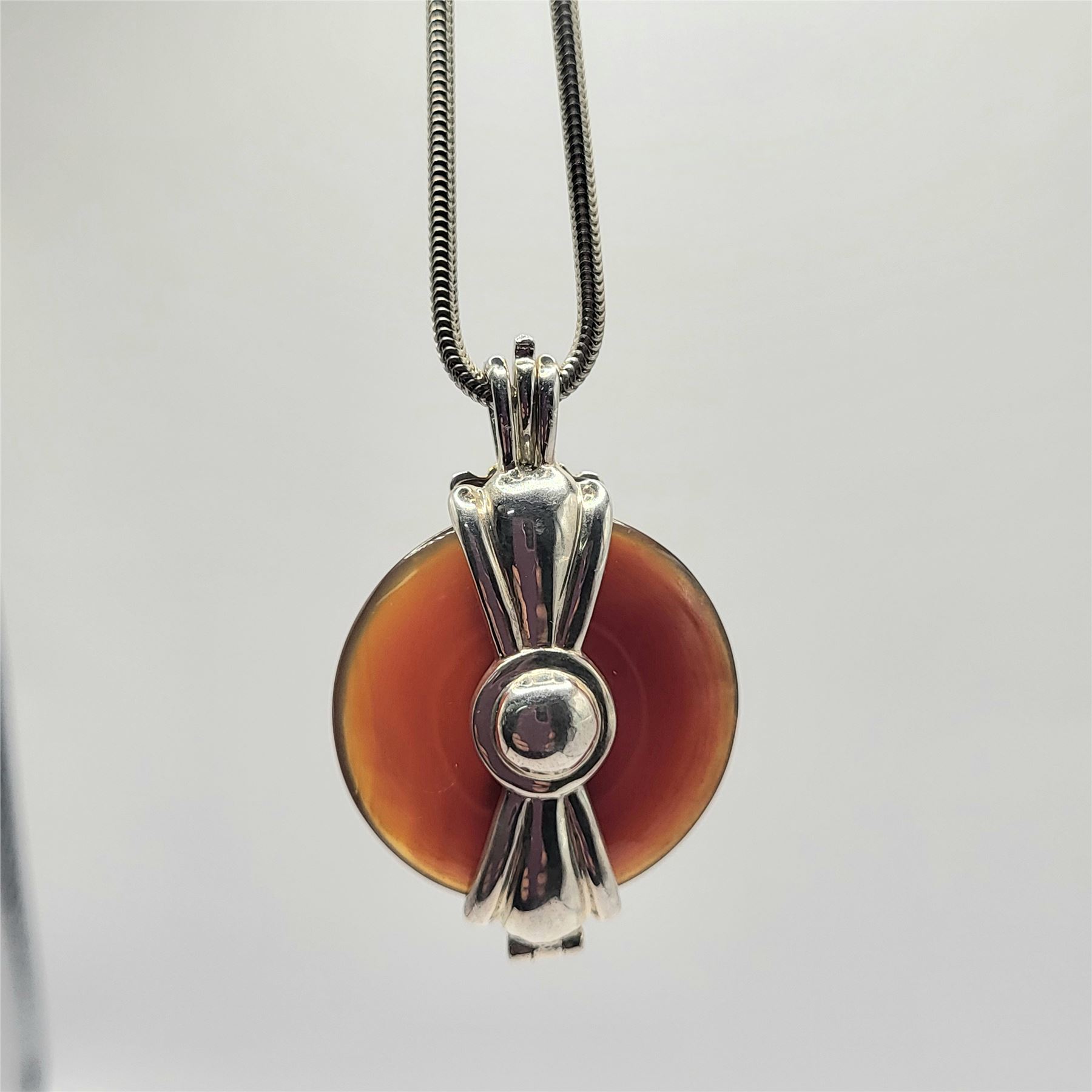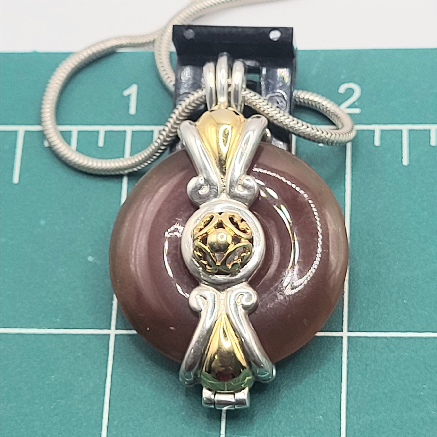 This is a sterling silver (.925) necklace with a sterling silver and gold tone, interchangeable pendant that is currently holding an orangish-brownish jadeite pi stone. The pi stone is approximately 1 1/8& quot; diameter and it hangs from a 24& quot; sterling silver snake chain with a lobster clasp.& nbsp; (To change the pi stone, first remove the chain, then simply open from the tab at the top of the bail).& nbsp; NO OTHER PI STONES ARE AVAILABLE WITH THIS LISTING.