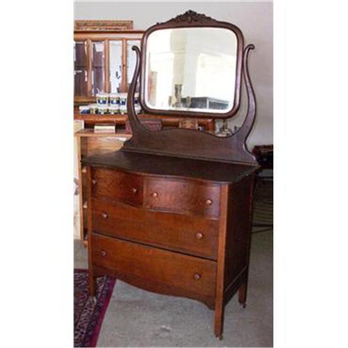 <table width="100%" border="0" cellspacing="0" cellpadding="4"><tr><td><em> </em></td></tr><tr> <td width="100%"> This dresser with mirror may date to the early 1900s and features a dark mahogany stained wood and a curvilinear design. The top of the mirror also features a carved design at its center. This dresser contains four drawers, two small drawers on top, and two larger drawers below them. The drawers all contain key holes, but there is no key with this piece. The dresser also contains caster wheels at its base, and the mirror may be detached for easy moving from one room to another. This piece is in very good condition for its age--there are some tiny, barely noticeable chips in the finish on the dresser, but other than this, the piece is in excellent shape. Shipping costs will be calculated at the time of purchase (as costs will vary depending on the location of the buyer) at the best possible rate. </td></tr><tr> <td> </td></tr><tr> <td>Reference #: RAF5170</td></tr><tr><td>Condition:very good</td></tr><tr><td>Year:early 1900s</td></tr><tr><td>Height:71</td></tr><tr><td>Depth:20</td></tr><tr><td>Width:38</td></tr><tr><td>Title:Dark Stained Dresser With Mirror</td></tr><tr><td>Materials:wood, mirror</td></tr><tr><td>Location:Marion, SC</td></tr></table>
