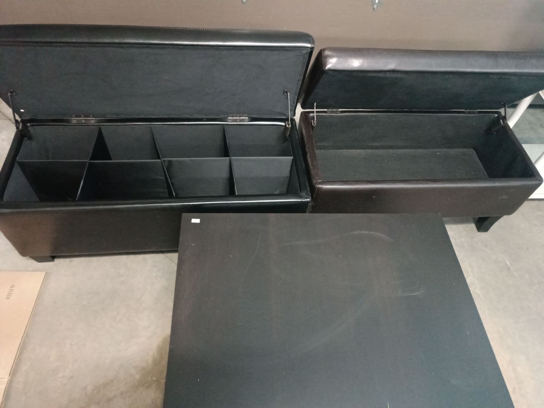 Dark Wooden Table with 2 Storage Benches; Table is 47W, 31D, 18T; Largest Bench is 40W, 16D, 18T