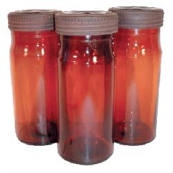 Dark amber fruit jars (3); 7.5" tall jars w/shoulder 2" from lip, screw on metal lid w/glass insert w/raised center, unmarked, all Exc. condition.