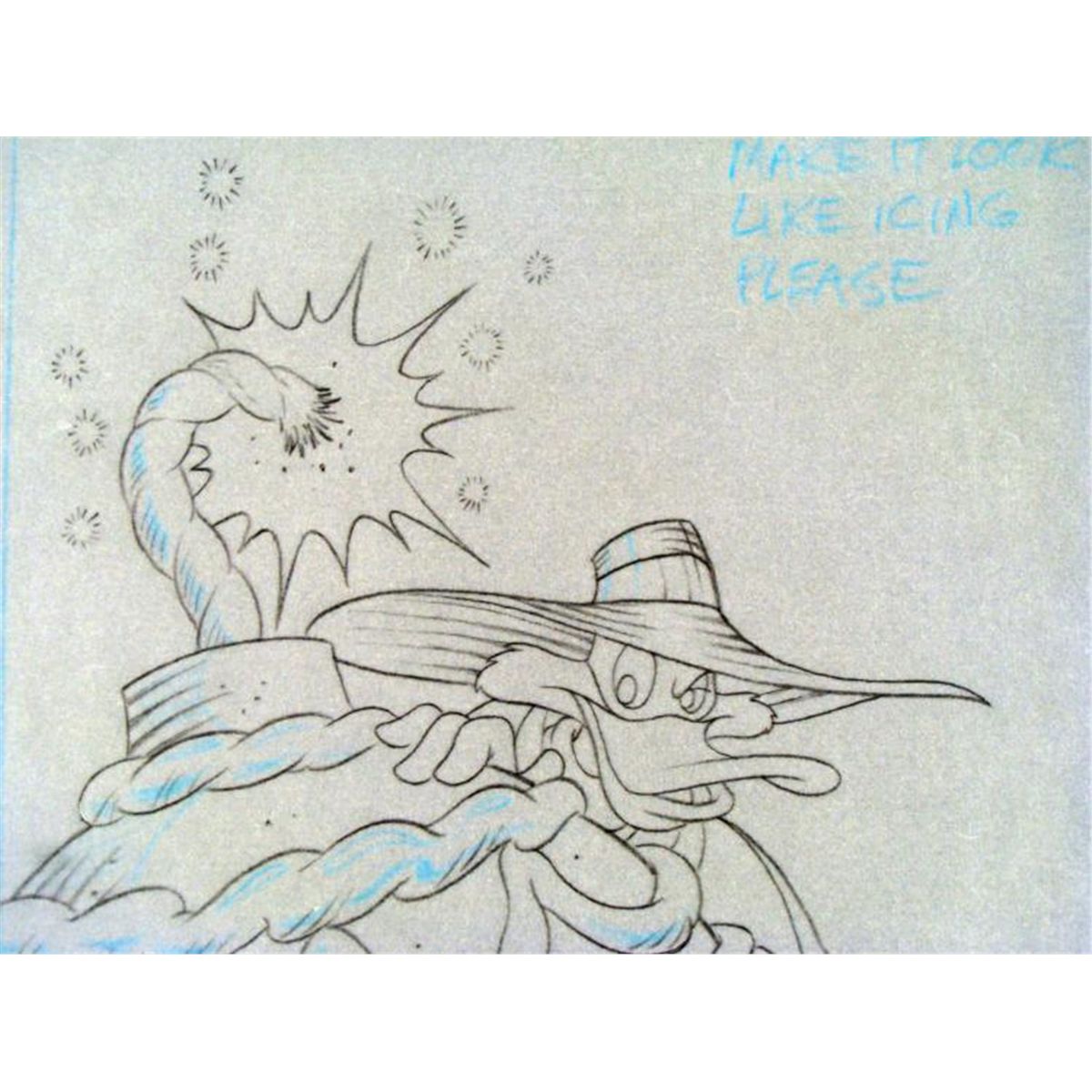 Offered here is an original production drawing of Darkwig from Darkwig Duck cartoon series. Darkwing Duck is about the adventures of the titular superhero, aided by his sidekick and pilot Launchpad MacQuack. In his secret identity of Drake Mallard, he lives in an unassuming suburban house with his adopted daughter Gosalyn, next door to the bafflingly dim-witted Muddlefoot family. Darkwing struggles to balance his egotistical craving for fame and attention against his desire to be a good father to Gosalyn and help do good in St. Canard. Most episodes put these two aspects of Darkwing's character in direct conflict, though Darkwing's better nature usually prevails. * * This is going to be the most explosive birthday party ever!! * Original "rough" animation drawing, in black and non-photo blue with the notations in black and non-photo blue. * Overall size is a 12-field drawing that is 10 1/2" × 12 1/2" Very Good condition Traditional animation is a multi-step process which includes various types of art techniques. Drawings are a key part of the process, in which the animator creates the design and movement of the characters. Drawings are then transferred onto acetate cels (by hand-inking and/or photo copying) to create a production cel, which is then hand painted on the back side, using paint colors chosen and approved by the creator of the series. * * The drawing is ready to be matted and framed. The animators notations are located throughout the drawing. The drawing appears to be on parchment paper. *