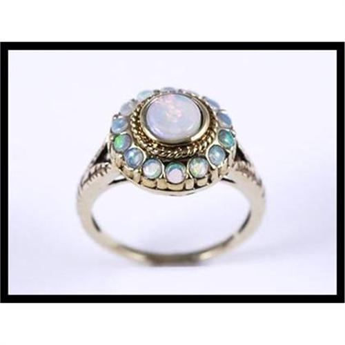 Darling ring with 1 round cut opal (7.7 millimeters) surrounded by 12 small round opals set in 14K yellow gold. The size 7 ring measures 12.9 millimeters (0.51 inches) in diameter and weighs 8.20 grams total weight.