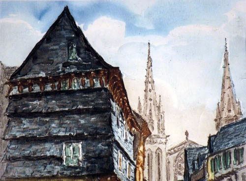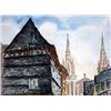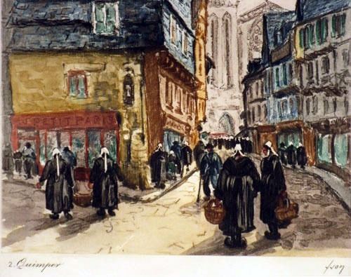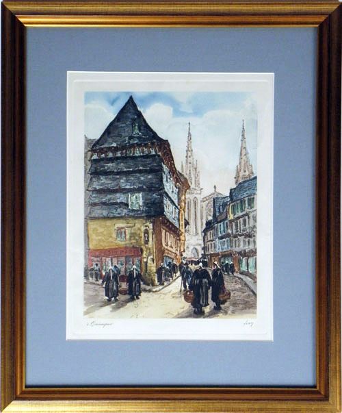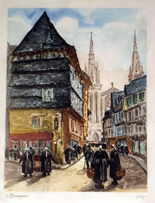 Darling Captivating Colored Litho of Breton, French Town. Colored French lithograph. From editions Yvon, established in 1919, this is a beautiful hand-colored lithograph depicting a street in Quimper, Brittany, France. The architectural interest, colorful in the foreground, and muted in the background, is enhanced by the presence of townspeople in the street wearing local costume. Minor damage, to the paper at each side, but beautifully presented and exceedingly charming nonetheless. Size: 15X12 inches. Country of Origin: France.