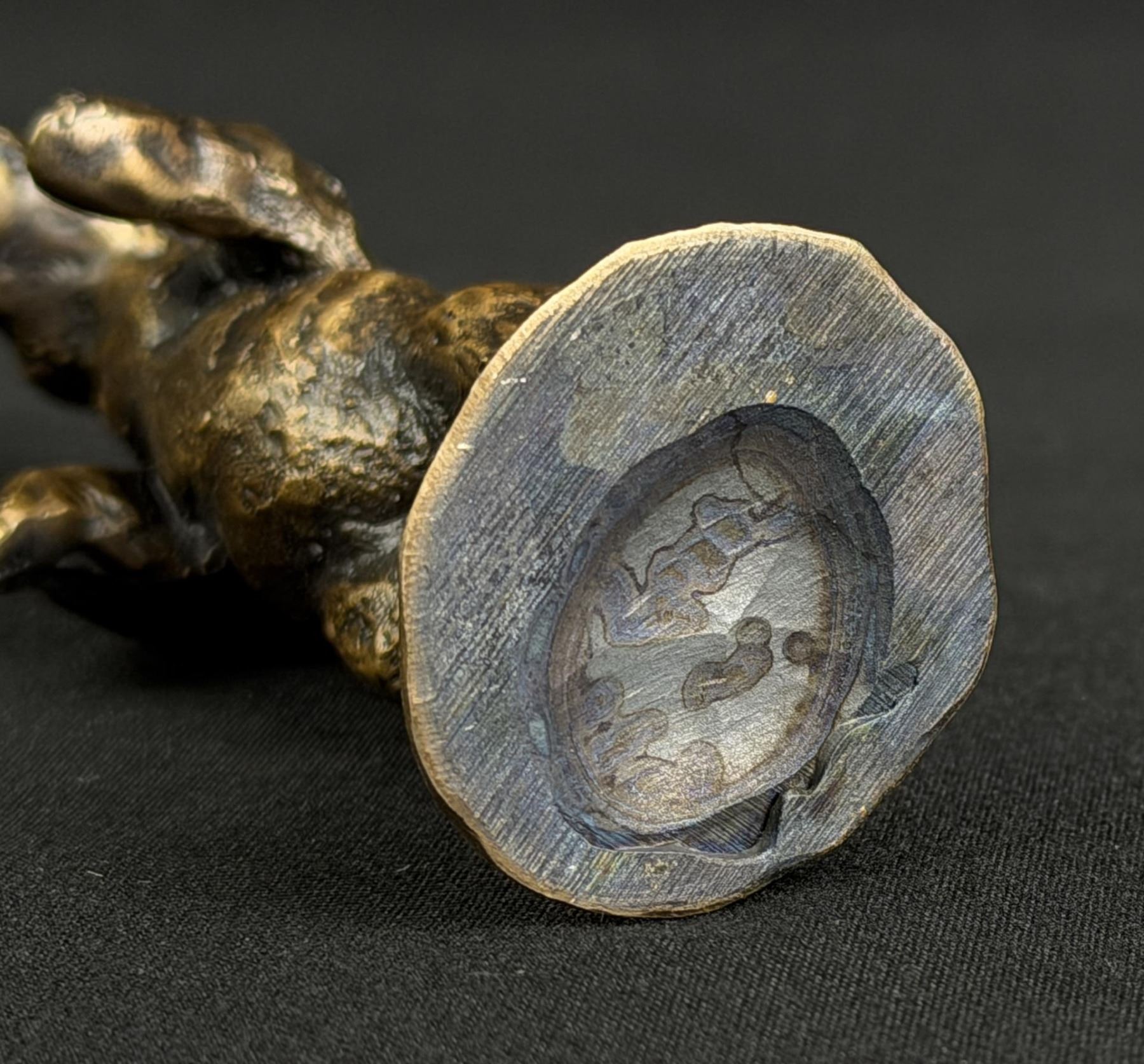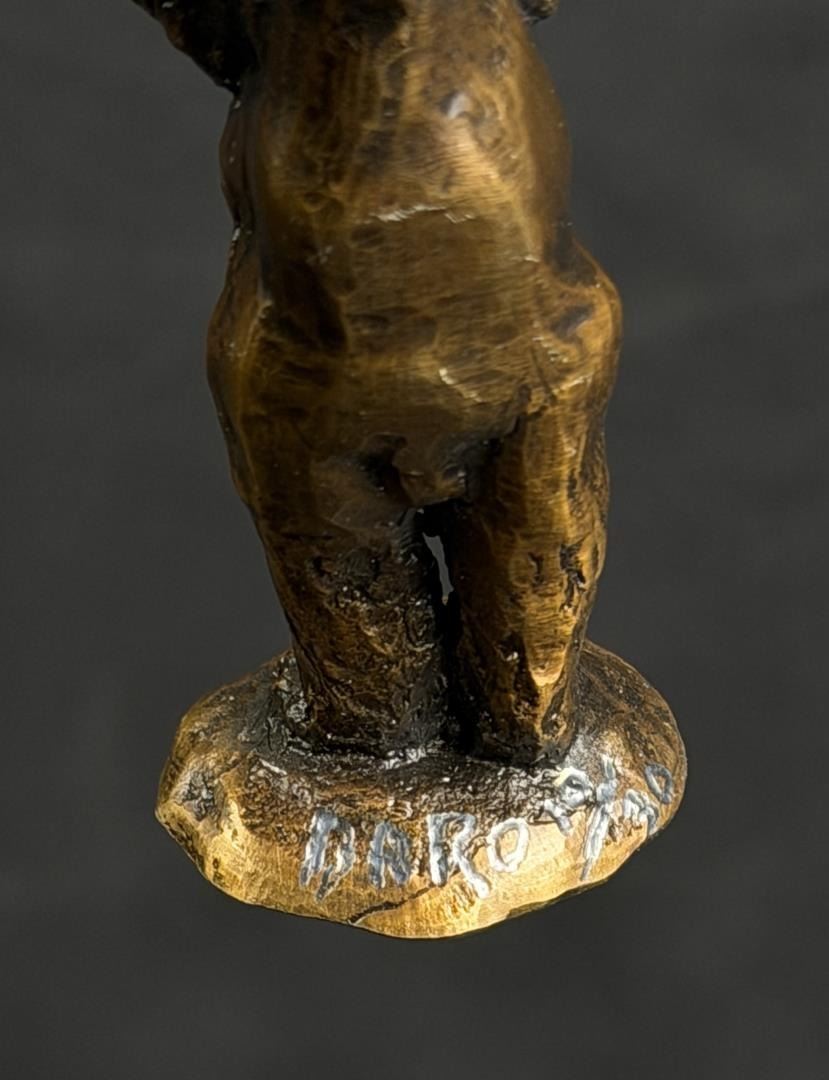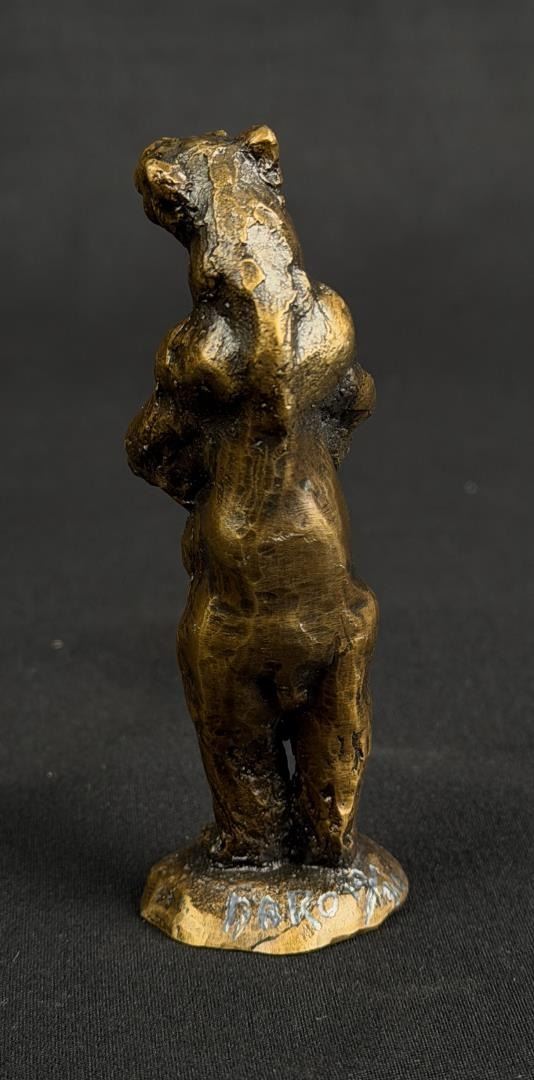 Title is Alert Bear. 3 5/8" by 1 3/8" by 1 3/8". 19/30. Daro Flood (1954 - 2017) was active/lived in Arizona. Daro Flood is known for Portrait bust Indian and cowboy sculpture. Daro Flood was a jeweler who made the decision to fully dedicate himself to realist sculpture. His studio is in Arizona, and he derives his subject matter from personal experiences depicting the people and places with which he has had contact. American Indians of the western United States are a favorite subject, and he has received commissions for public art. Longtime Jackson resident Daro M. Flood died Dec. 23, 2018 at his home in Jackson. He was 63.