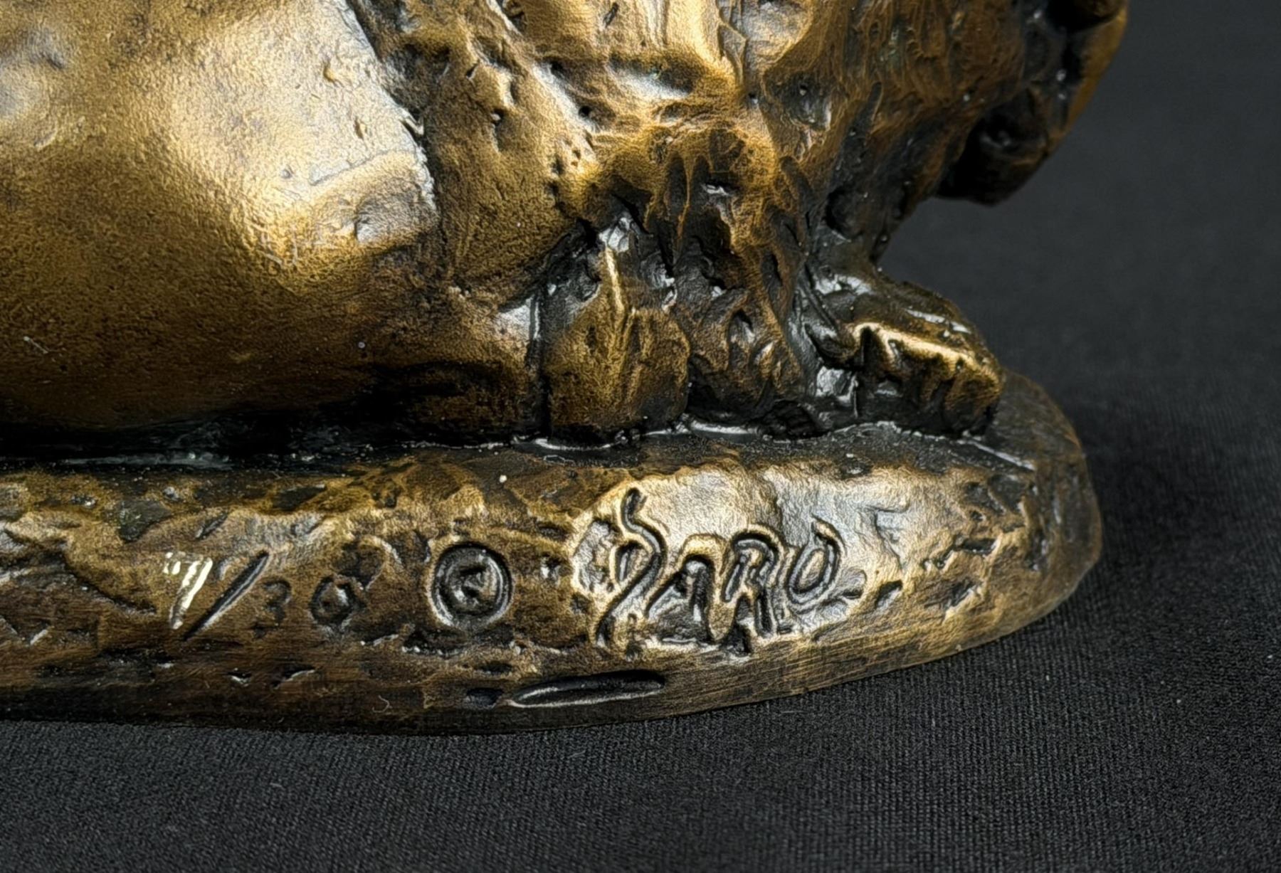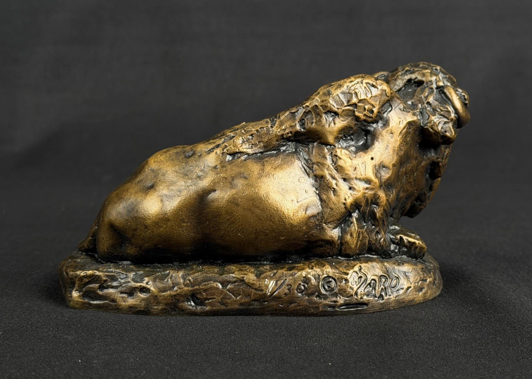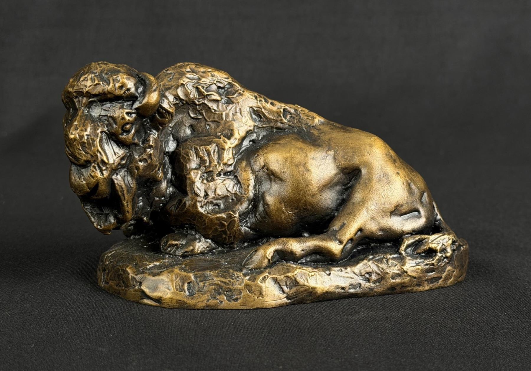 Title is Reclining Buffalo. 4 1/2" by 2 1/2" by 2 1/2". 7/30 Daro Flood (1954 - 2017) was active/lived in Arizona. Daro Flood is known for Portrait bust Indian and cowboy sculpture. Daro Flood was a jeweler who made the decision to fully dedicate himself to realist sculpture. His studio is in Arizona, and he derives his subject matter from personal experiences depicting the people and places with which he has had contact. American Indians of the western United States are a favorite subject, and he has received commissions for public art. Longtime Jackson resident Daro M. Flood died Dec. 23, 2018 at his home in Jackson. He was 63.