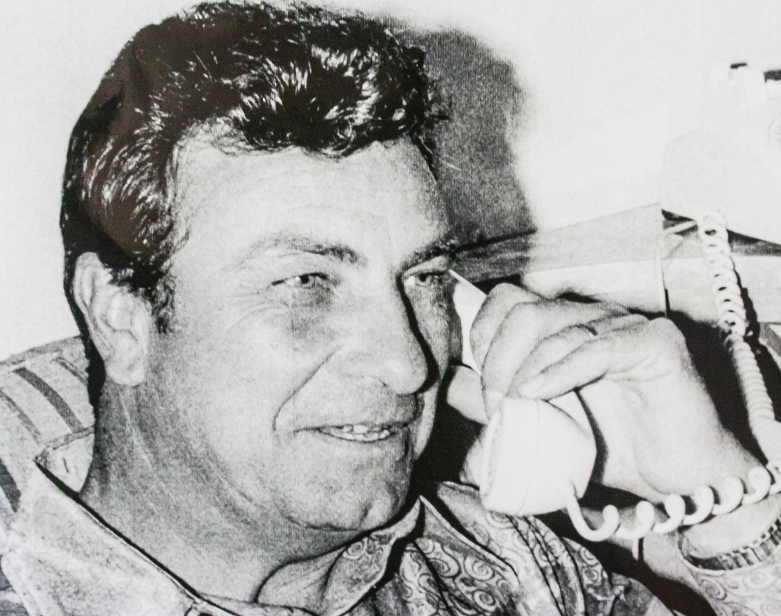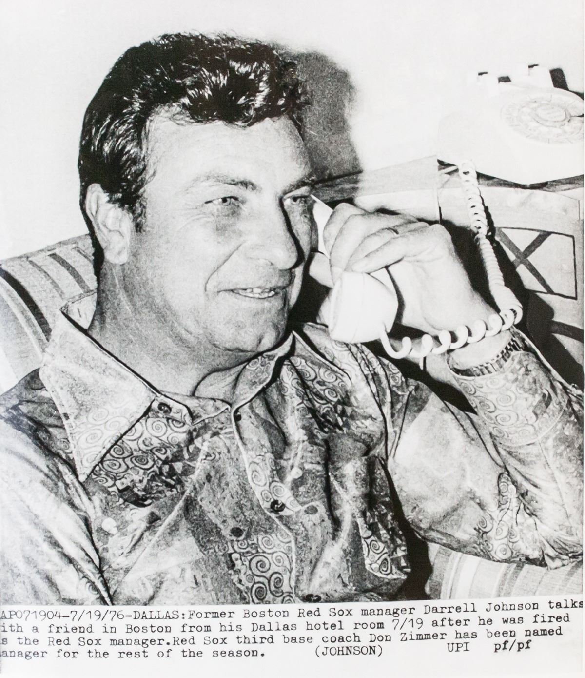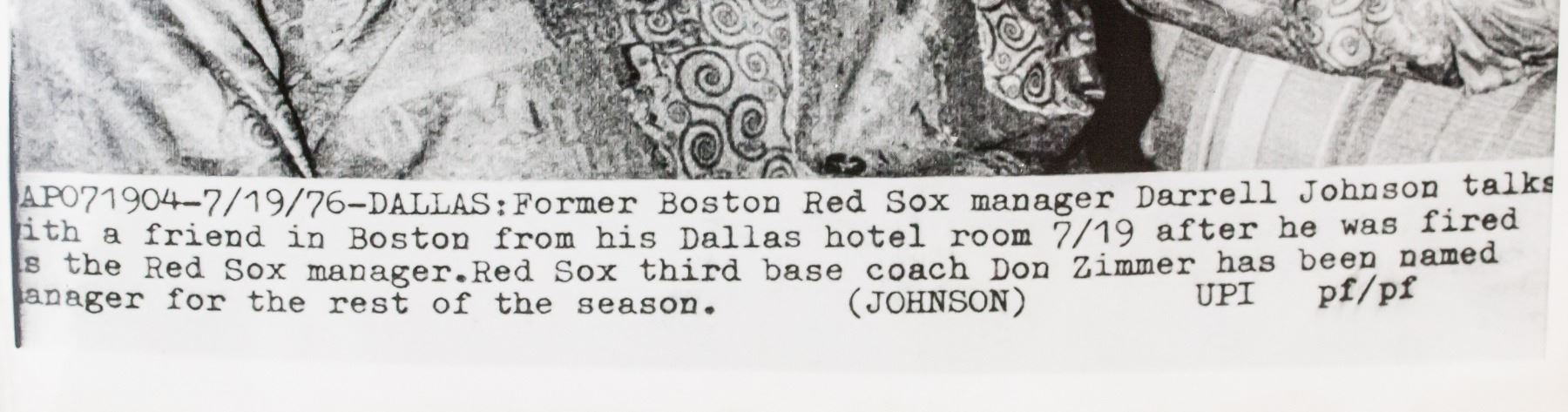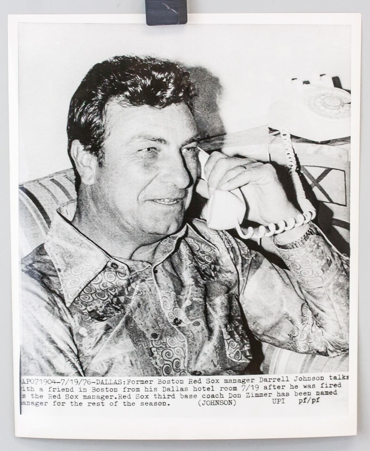 Photograph of Boston Red Sox manager, Darrell Dean Johnson (1928-2004, American). The bottom inscribed "AP071904-7/19/76-DALLAS: Former Boston Red Sox manager Darrell Johnson talks with a friend in Boston from hsi Dallas hotel room 7/19 after he was fired as the Red Sox manager. Red Sox third base coach Don Zimmer has been named manager for the rest of the season. (JOHNSON) UPI pf/pf". 10 x 8 inches