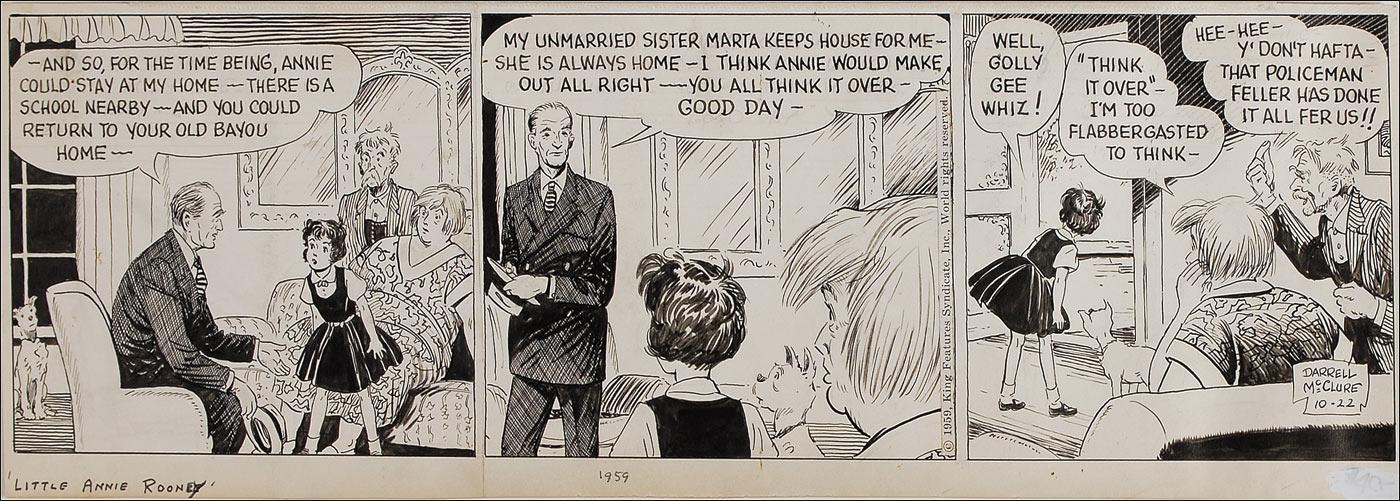 Original hand-inked three-panel Little Annie Rooney comic strip, dated October 22, 1959 on an off-white 18.5 x 6 piece of artist cardstock. The strip places Annie in a moral dilemma. Signed in black ink on the last panel. Horizontal fold between the first and second panels, scattered toning, edge toning, and a couple editorial notations, otherwise fine condition.
