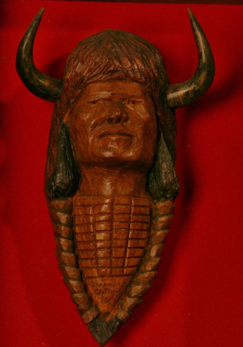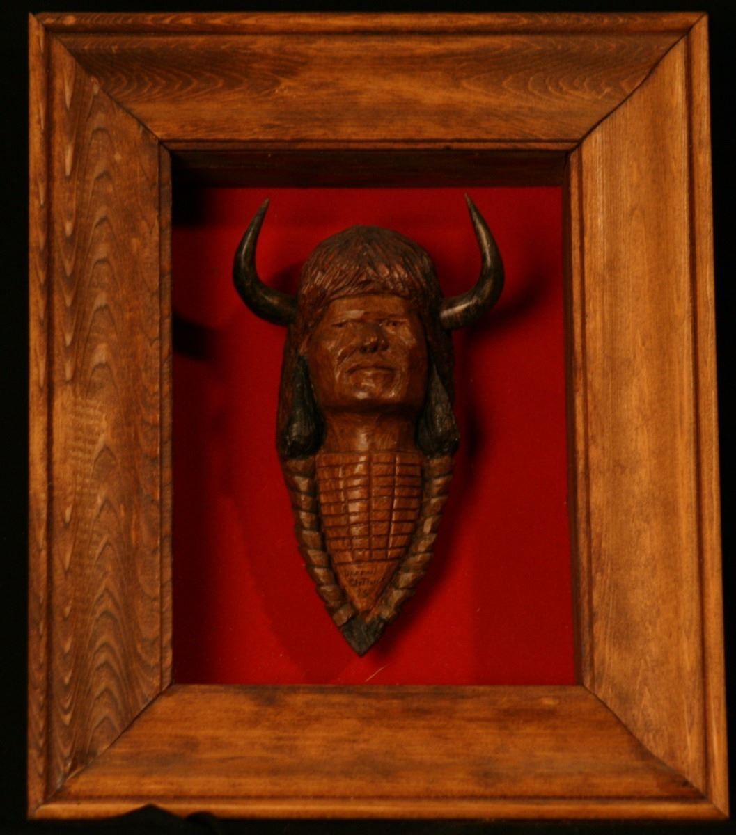 Man with bull horns, 6" x 4" x 2", signed lower, '75, in nice shadow box, 12" x 10", -562980-