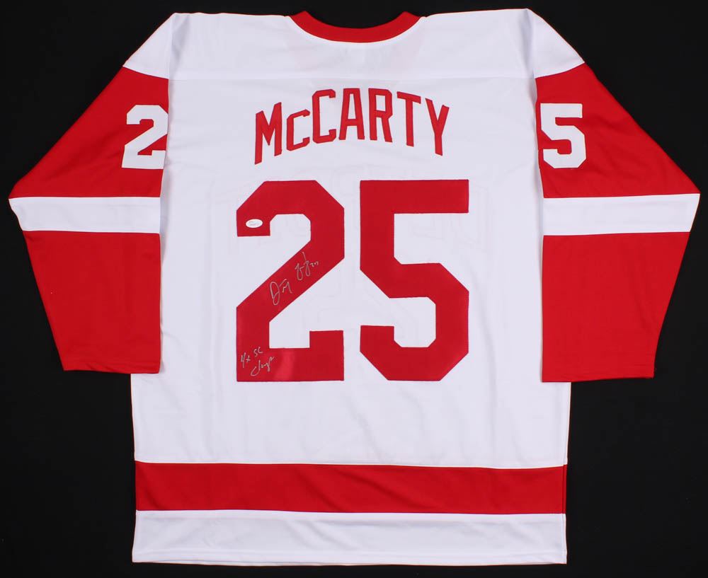 Custom on-ice style jersey. Everything is sewn on, size XL. Hand-signed and inscribed in silver paint pen by Darren McCarty.