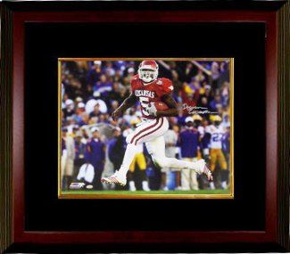 Darren McFadden played college football for the University of Arkansas Razorbacks from 2005 to 2007. McFadden was drafted fourth overall by the Oakland Raiders in the 2008 NFL Draft. A widely touted recruit, he chose to attend Arkansas. He was a two-time member of the Associated Press All-America team as a tailback for the Razorbacks in 2006 and 2007. In 2006, he became the first sophomore to win the Doak Walker Award, the award honoring the nation's top collegiate running back. He joined Ricky Williams as only the second two-time winner after taking home the award again in 2007. McFadden also won the 2007 Walter Camp Award as the nation's best player. Darren McFadden has hand autographed this Arkansas Razorbacks 16x20 Photo. Custom Black Mat and Premium Mahogany Frame as shown. McFadden Hologram and Certificate of Authenticity from Athlon Sports.
