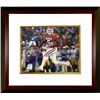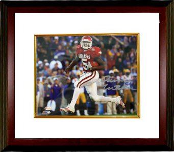 Darren McFadden played college football for the University of Arkansas Razorbacks from 2005 to 2007. McFadden was drafted fourth overall by the Oakland Raiders in the 2008 NFL Draft. A widely touted recruit, he chose to attend Arkansas. He was a two-time member of the Associated Press All-America team as a tailback for the Razorbacks in 2006 and 2007. In 2006, he became the first sophomore to win the Doak Walker Award, the award honoring the nation's top collegiate running back. He joined Ricky Williams as only the second two-time winner after taking home the award again in 2007. McFadden also won the 2007 Walter Camp Award as the nation's best player. Darren McFadden has hand autographed this Arkansas Razorbacks 8x10 Photo. Custom White Mat and Dark Mahogany Frame as shown. McFadden Hologram and Certificate of Authenticity from Athlon Sports.