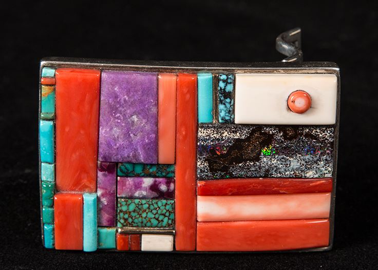 Darryl Edwards (1960 - ) Belt Buckle.2" x 3". Multi-stone inlay set stone to stone in sterling silver buckle. Stones include fossilized ivory, opal, coral, angel skin coral, sugilite and a variety of turquoise including Sleeping Beauty and Spider Web.