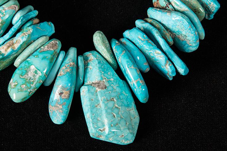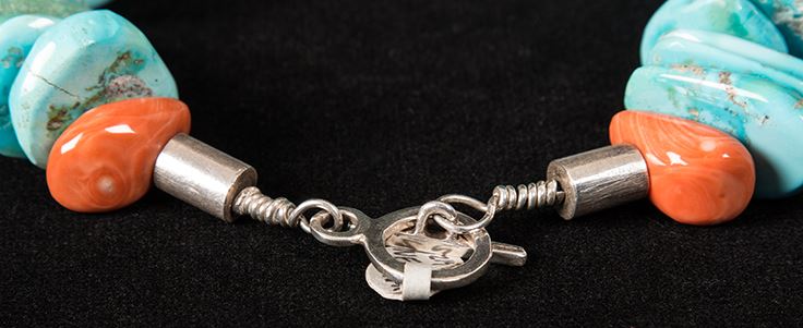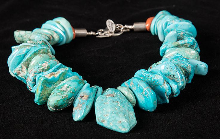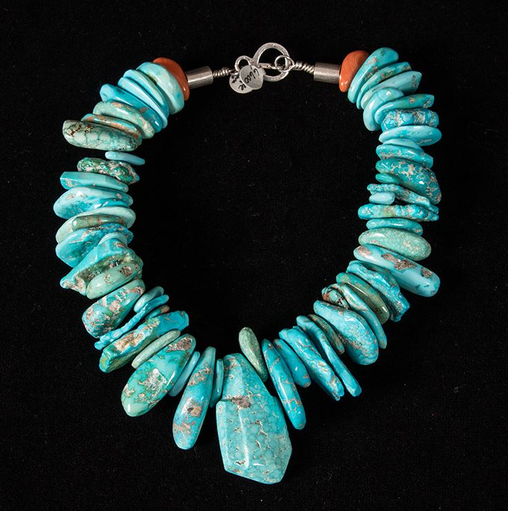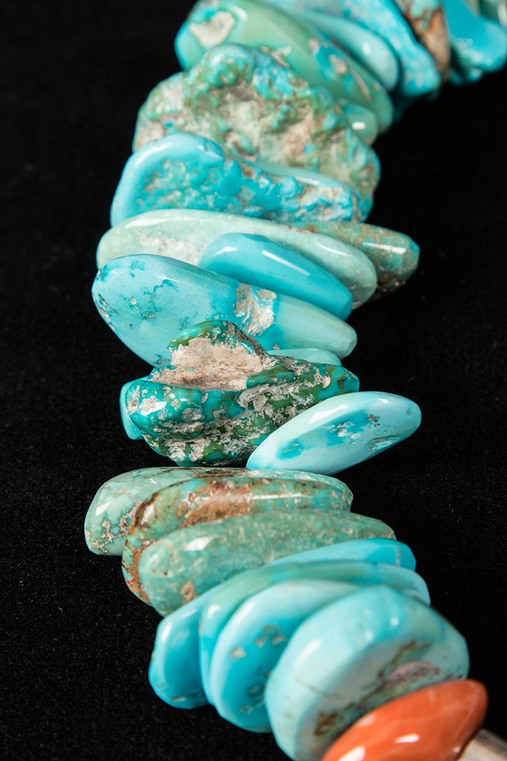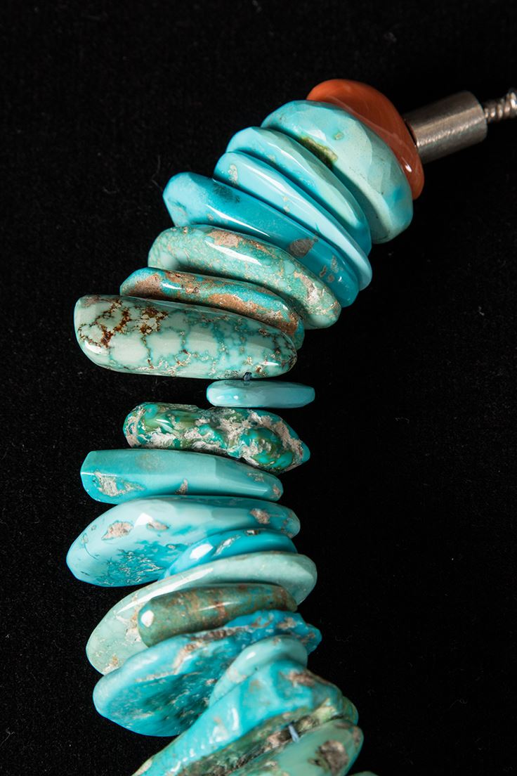 Darryl Edwards (1960 - ) Necklace. 17" long fine turquoise necklace. Sterling silver and coral. Combination of Kingman, Cripple Creek and Blue Gem Turquoise.