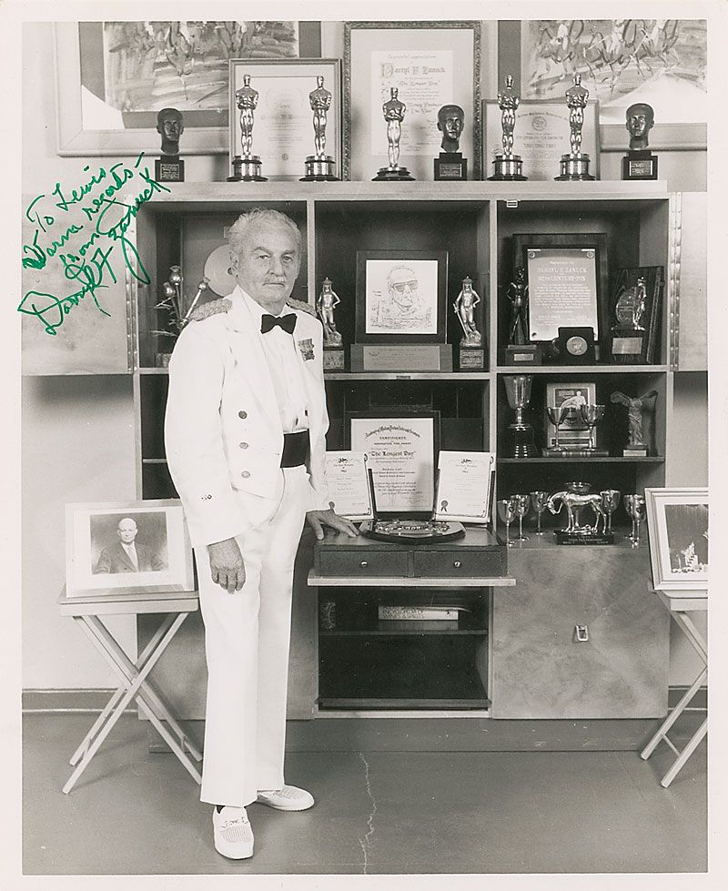 Glossy 8 x 10 photo of Zanuck posing in front of his trophy case, signed and inscribed in green felt tip, “To Lewis, Warm regards—from Darryl F. Zanuck.” In fine condition.