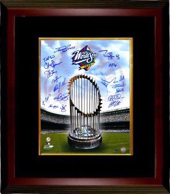 The New York Yankees' 1998 season was the 96th season for the Yankees. The team finished with a franchise record regular-season standing of 114–48. In the postseason, they swept the Texas Rangers in the American League Division Series, won the American League pennant by beating the Cleveland Indians four games to two in the American League Championship Series, and swept the San Diego Padres to capture their 24th World Series. Including the playoffs, the 1998 Yankees won a total of 125 games against 50 losses, an MLB record. They are widely considered to be one of the greatest teams in baseball history. The 125 wins (regular season and playoffs combined) was the most by a championship team, surpassing the previous record of 116, set by their cross-town rivals, New York Mets in 1986. This 1998 Yankees World Series Logo and Trophy 16x20 Photo is signed by: Scott Brosius w/MVP insc, Darryl Strawberry, Chad Curtis, Mike Stanton, Todd Erdos, Shane Spencer, Mike Jerzembeck, Willie Banks, Jim Bruske, Jose Cardenal, Ryan Bradley, Ramiro Mendoza, Jay Tessmer, Mike Vigga, Homer Bush, Jeff Nelson, Mike Buddie and Chili Davis. Leaf Authentics Hologram and Certificate of Authenticity from Athlon Sports. Custom Black Mat and Premium Mahogany Frame as shown.