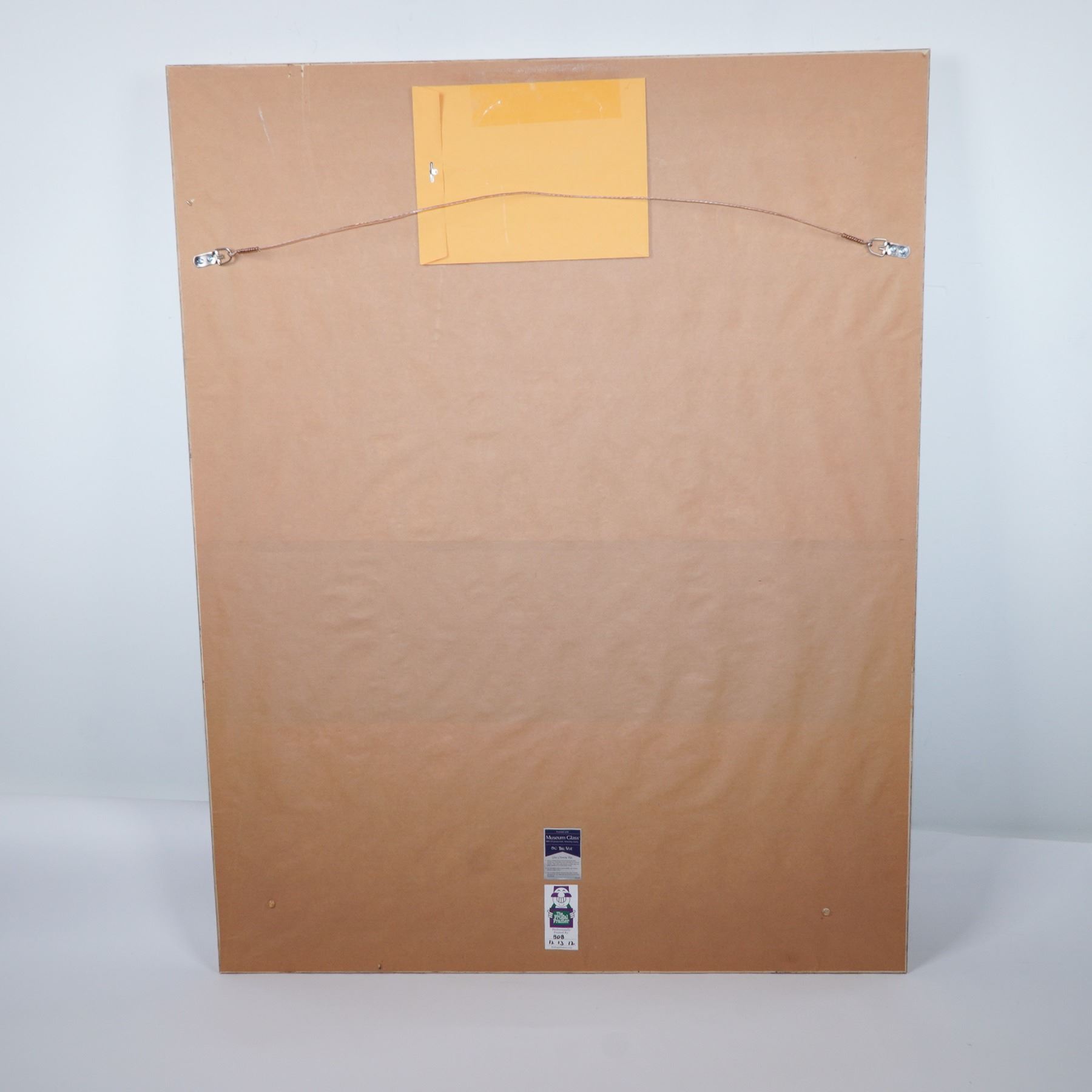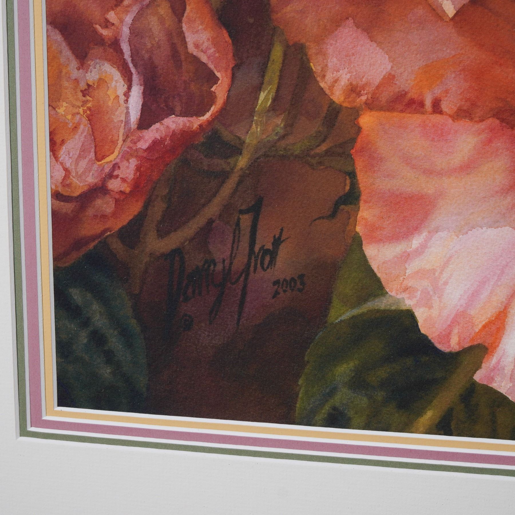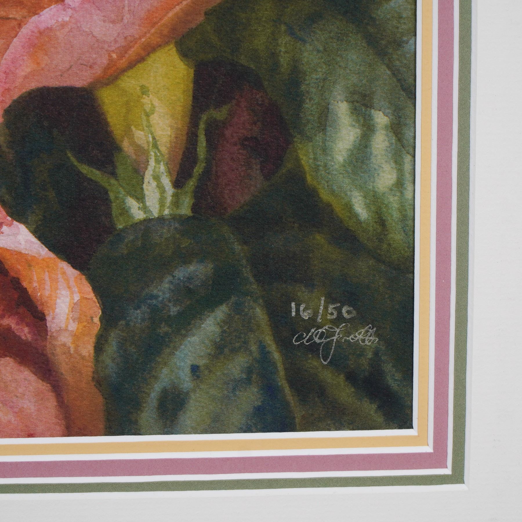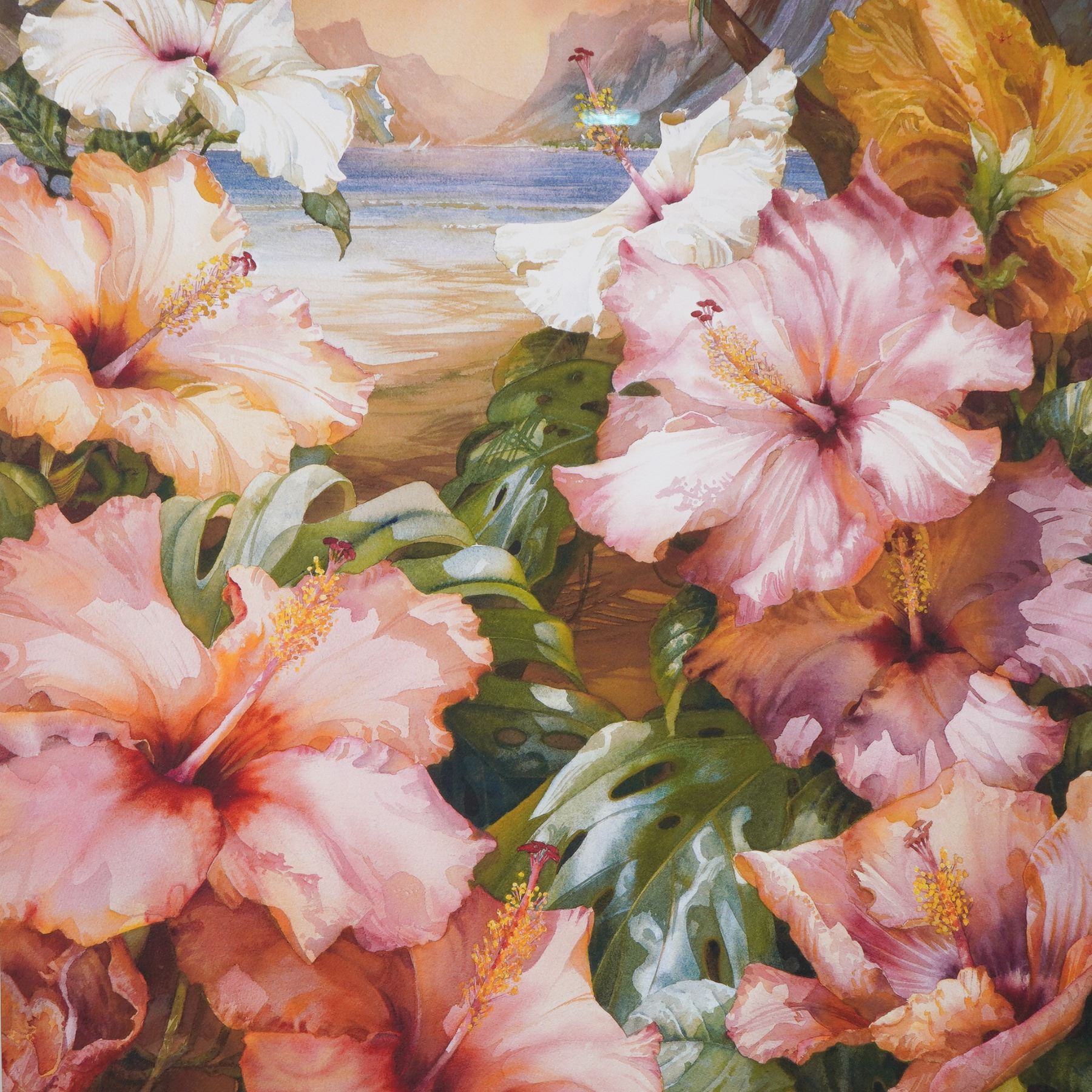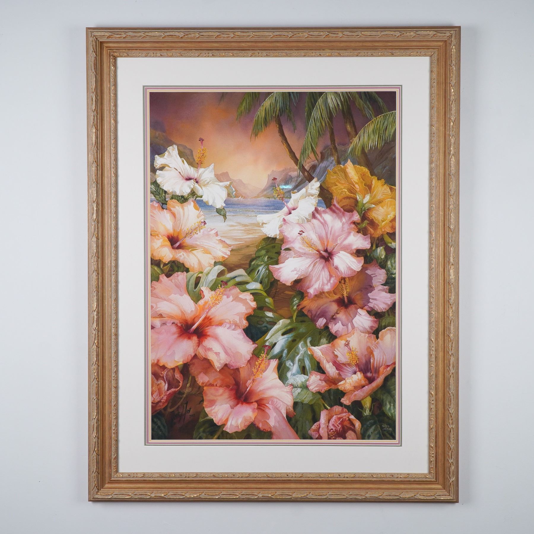 Limited edition print on Arches paper entitled Magnificent Magnolias by Australian watercolorist Darryl Trott, numbered 283/950 and signed by the artist. This work showcases Trott's signature floral realism, with a lush arrangement of hibiscus blooms in soft pinks, creams, and golds set against a tropical Hawaiian landscape. The detailed botanical rendering is enhanced by a warm sunset backdrop with palm trees, evoking a serene island ambiance. The piece is framed with a decorative border that complements its vibrant composition. Accompanied by a certificate of authenticity from Hana Coast Gallery, which originally retailed the work. Trott was known for his meticulous floral depictions, and this piece exemplifies his mastery in capturing the delicacy and vibrancy of nature through watercolor. Due to its impeccable size, this item requires Third Party Shipping or Local Pickup only.