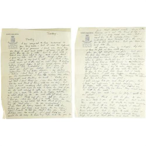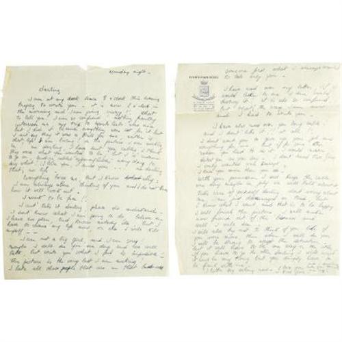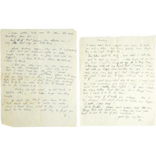 <B>Darryl Zanuck's Love Letters from Bella Darvi.</B></I> One of the most pitifully grim of all Hollywood tragedies was the scandal and suicide of Bella Darvi. Born Bayla Wegier in Poland in 1928, she was a stunningly beautiful brunette who survived a World War II concentration camp to become a discovery of producer Darryl F. Zanuck. Both Zanuck and his wife Virginia originally sponsored her -- indeed, "Darvi" was an abbreviation of their first names -- and she became a Hollywood star, notably as "Nefer" in Zanuck's lavish 1954 <I>The Egyptian.</B></I> However, after Virginia learned Darryl and Bella were lovers, she threw her out and sent her back to Europe. Bella acted sporadically, but never recovered emotionally from her affair with Zanuck and, in 1971, killed herself in her Monte Carlo apartment by turning on the gas. Her body wasn't discovered for ten days. These three intensely private and heartbreaking letters from Bella Darvi to Zanuck reveal her harrowing torment. The first letter, three pages long, is on Elysee Park Hotel of Paris stationery, and Bella desperately writes, "...I live like nobody else does, alone every night and thinking too much!! Darling...You will never be able to leave her and if you do she will always be after us!" It concludes, "I love you. I kiss you. and I sometimes hate you to make me cry!" The second letter, two pages, includes her words "I want to be free!!" and "...I have to change my life now, or else I will kill myself... " concluding "...I just want to be alone - and try to forget you. B." The third letter, one page, insists "I love you with all my heart but I realize I can not make you happy...I wish I was dead! It is finished!...," and concludes "good bye my love - B." All three letters are written in fountain ink; none are dated, but the similar paper and ink suggest all were penned within the same brief period. Attesting to the tragic potency of this packet (and also included) is a scrap of paper from Zanuck himself, who had entrusted these letters to a confidante, writing, "Jack - Destroy without reading - Please - D.Z." The letters escaped destruction and survive as intimately personal testimony to an epic case of Hollywood scandal and self-destruction. All are in Very Fine condition. <I>Accompanied by LOA from PSA/DNA.</B></I><BR><BR><b>Shipping:</b> Flat Material, Small (<a target="_blank" href="http://www.heritageauctions.com/common/shipping.php">view shipping information</a>)