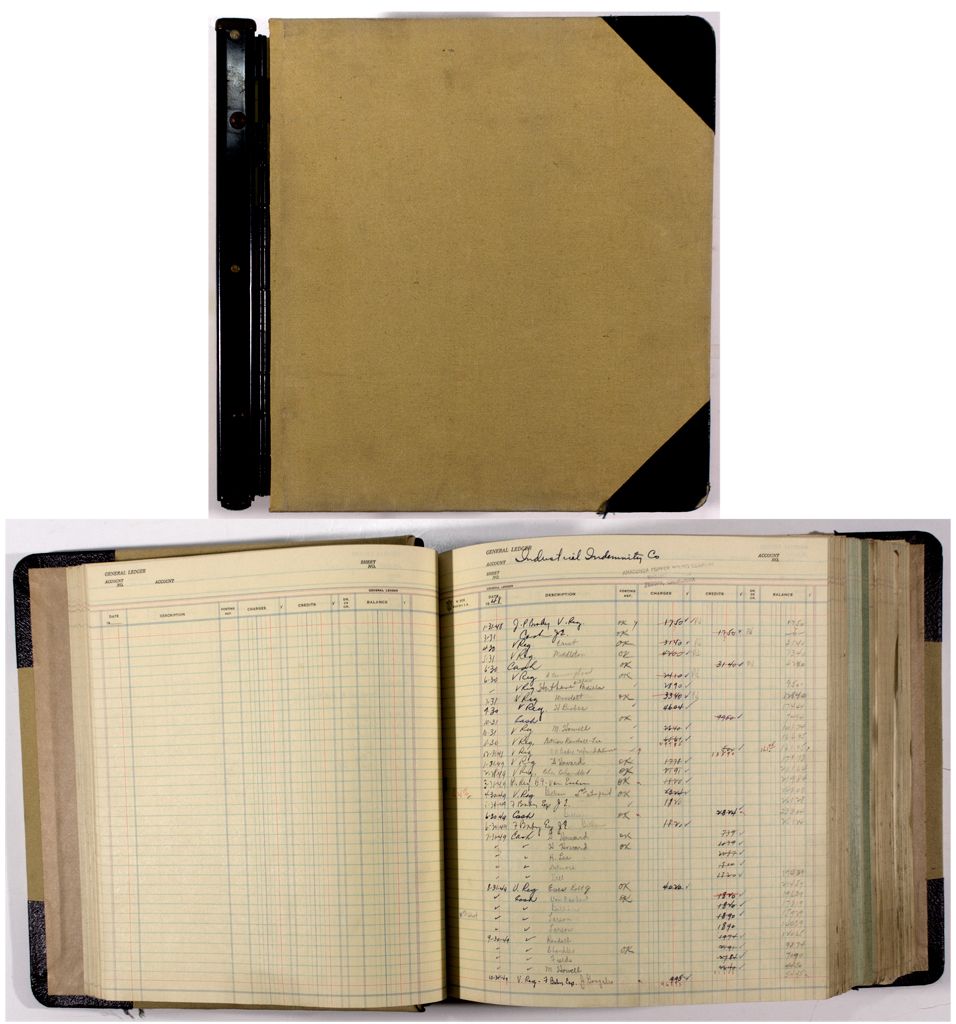 Large hard cover General Ledger Book with metal screw-binder spines. Individual pages assigned to numerous accounts, all hand-scribed, some with the business stamp on various pages. Darwin was a mining town founded in 1875 on silver and lead mining. Book measures 11 3/4" wide x 11 1/2" high x 3 1/2" thick. Very good condition. -59287