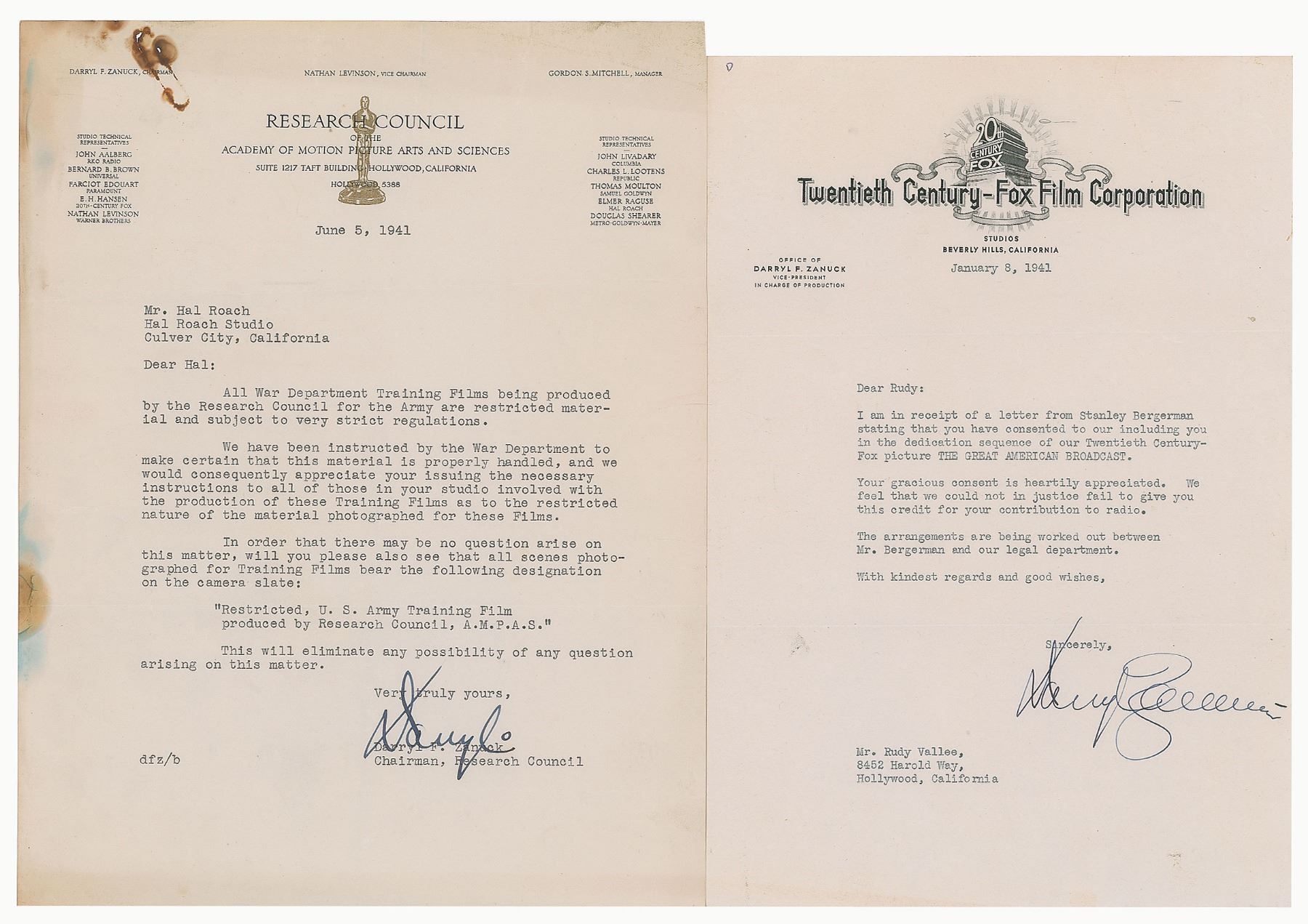 Two TLSs, signed “Darryl” and “Darryl Zanuck,” both one page, 7.25 x 10.5 and 8.5 x 11, dated January 8 and June 5, 1941. The earlier letter, written on Twentieth Century Fox Film Corporation letterhead, addressed to entertainer Rudy Vallee, in part: "I am in receipt of a letter from Stanley Bergerman stating that you have consented to our including you in the dedication sequence of our Twentieth Century-Fox picture The Great American Broadcast. Your gracious consent is heartily appreciated”; and the second, typed on Research Council of the Academy of Motion Picture Arts and Sciences letterhead, addressed to fellow producer and director Hal Roach as the nation was heading toward World War II, in part: "All War Department Training Films being produced by the Research Council for the Army are restricted material and subject to very strict regulations. We have been instructed by the War Department to make certain that this material is properly handled, and we would consequently appreciate your issuing the necessary instructions to all those in your studio involved with the production of these Training Films as to the restricted nature of the material photographed on these Films." In overall very good to fine condition, with staining and a rust paperclip impression to the Roach letter.