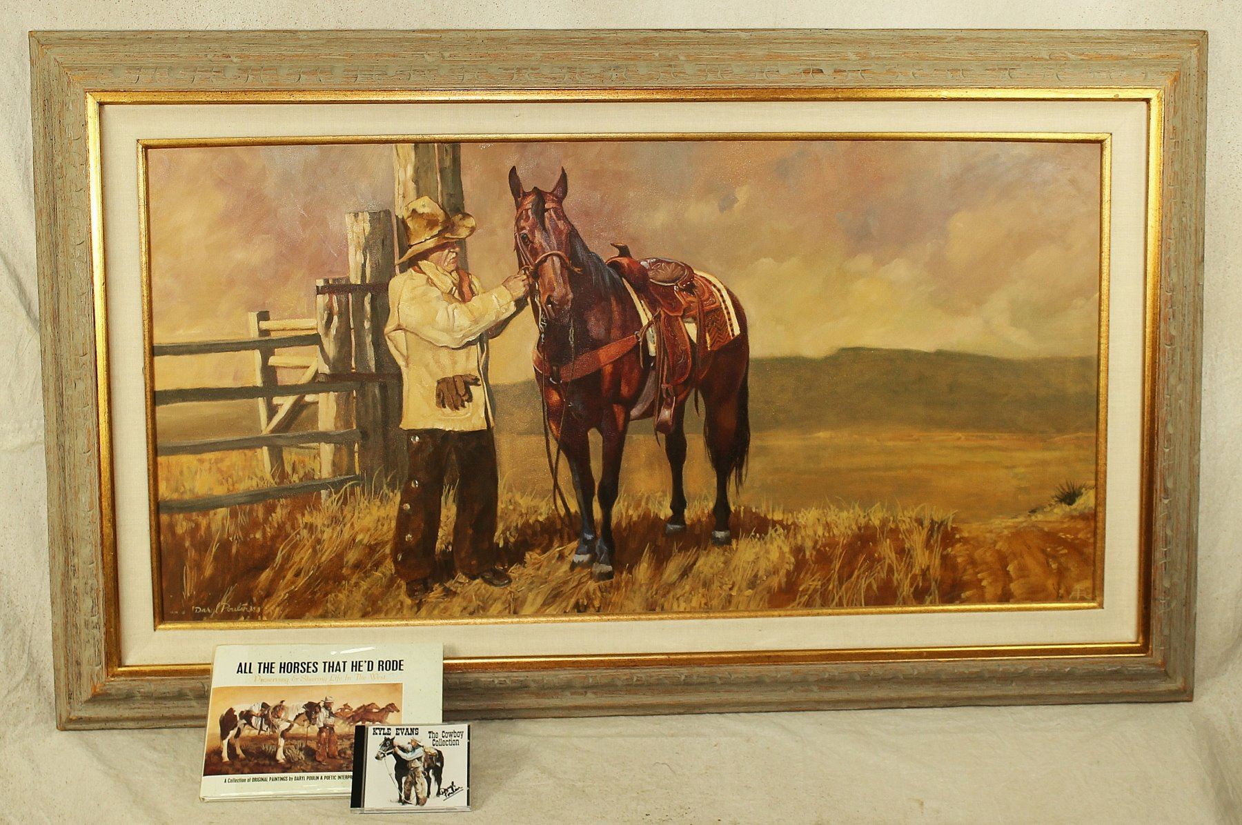 Original Oil Painting: “The Chairman of the Board”, by Artist Daryl Poulin (1947-); 24" x 48". A prolific cowboy, Indian and western artist. Poulin, once stated, ”I never painted a painting without putting a horse in it” did just that in this striking true scene of the west in this painting “The Chairman of the Board”. Daryl was raised in Maine, now lives in Wyoming, and paints the subjects of his passion. He attended the Art Institute Chicago for two years and gained his Bachelor of Fine Arts from the Portland Maine School of Art. Afterwards he spent the next 20 years in commercial art in Wisconsin and South Dakota. He turned to art as a professional soon afterwards, and sold his first painting to actress Melanie Griffith in 1993. Buffalo Bill Cody Stampede commissioned his work on their commemorative print, while the state of Wyoming hired Daryl to paint the covers of two State Maps. His work is renowned, has been featured in numerous publications, and featured in several galleries, and enjoyed and owned across the Country. And exceptional painting, by and exceptional artist.