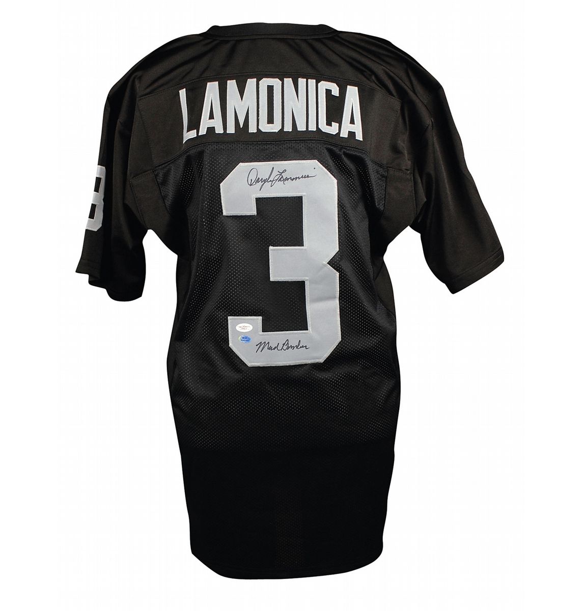 Replica Oakland Raiders football jersey, with sewn on letters and numbers, signed in black felt tip on the number on the back. In fine condition, with a James Spence authentication label affixed to number. Accompanied by a certificate of authenticity from James Spence.