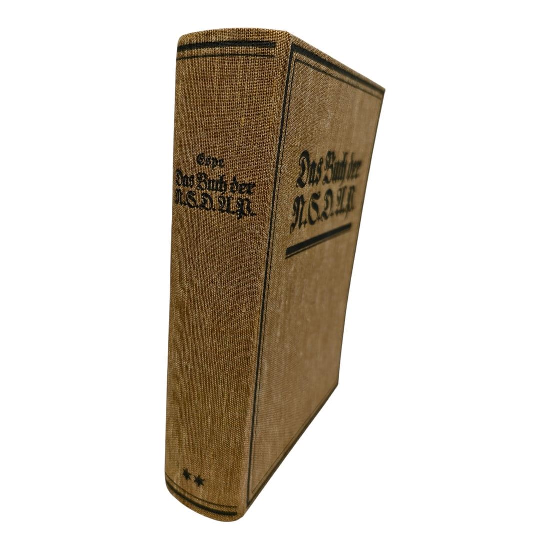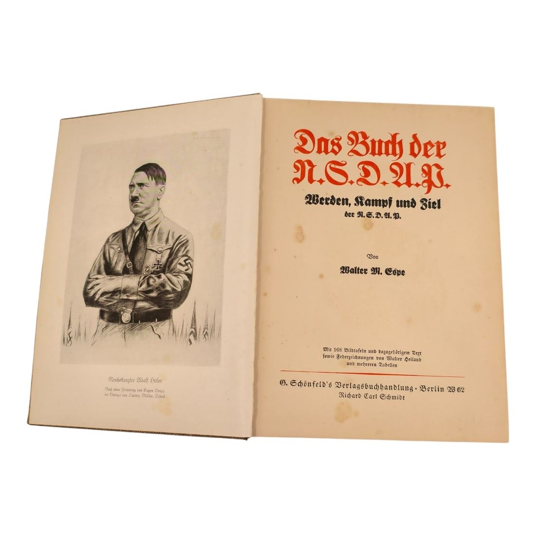 This volume was an official publication of the National Socialist German Workers’ Party (NSDAP), typically issued in the 1930s and distributed to party members, government officials, and institutions aligned with the Nazi regime.The book served as a comprehensive reference and ideological manual, containing:Organizational charts and structure of the NSDAPBiographies of key figures (including Adolf Hitler and senior party leaders)Descriptions of party offices, ranks, and insigniaPolitical philosophy and propaganda justifying Nazi ideologyPhotographs and statistical data highlighting the regime’s self-promotionThis volume was published in Berlin by G. Schönfeld’s Verlagsbuchhandlung, under the editorial direction of Richter Carl Schmidt. It includes 168 illustrations and contemporary documents, according to the title page.On the left page is a frontispiece portrait of Adolf Hitler, depicted in uniform with the Iron Cross and the Nazi Party armband — a common image used to deify Hitler and present him as a disciplined, almost mythic leader.