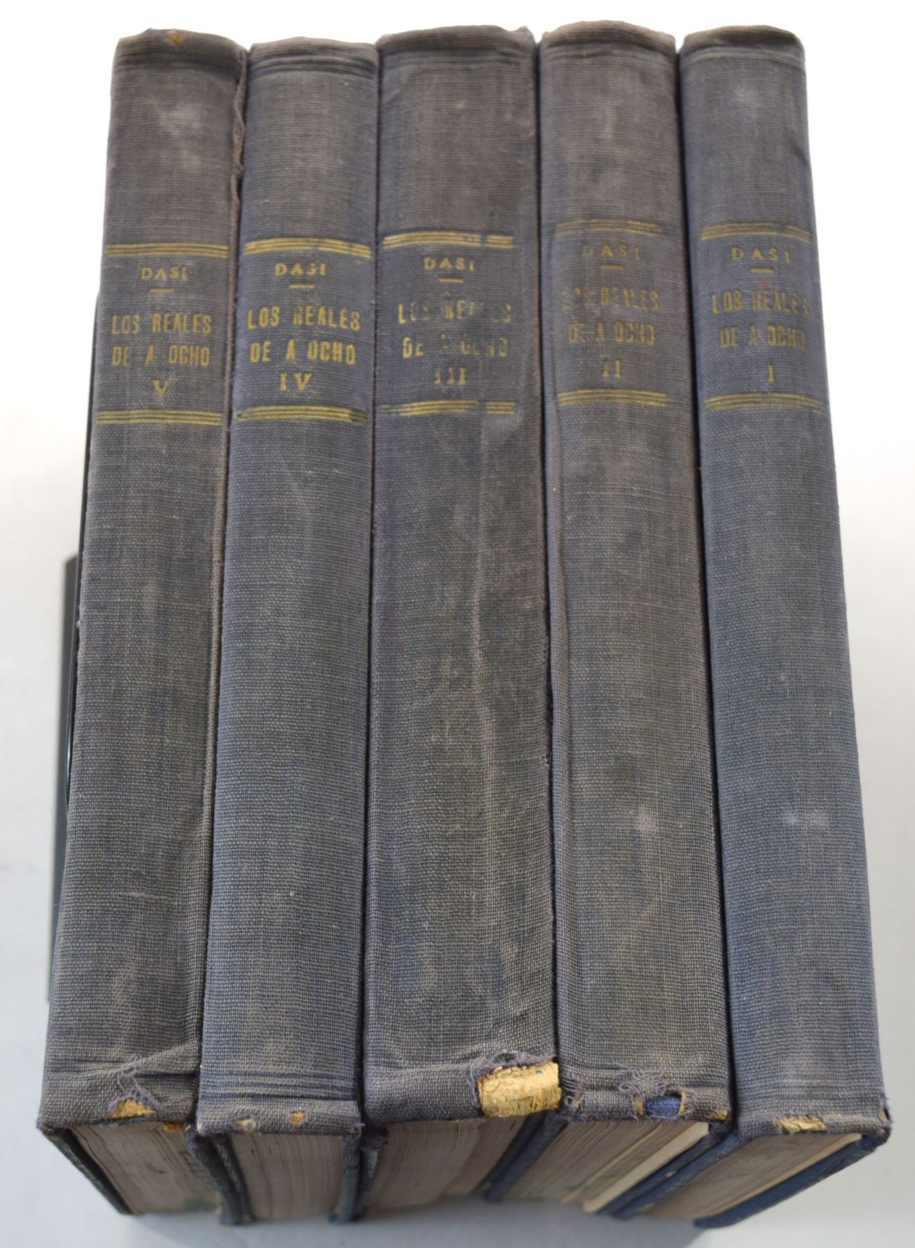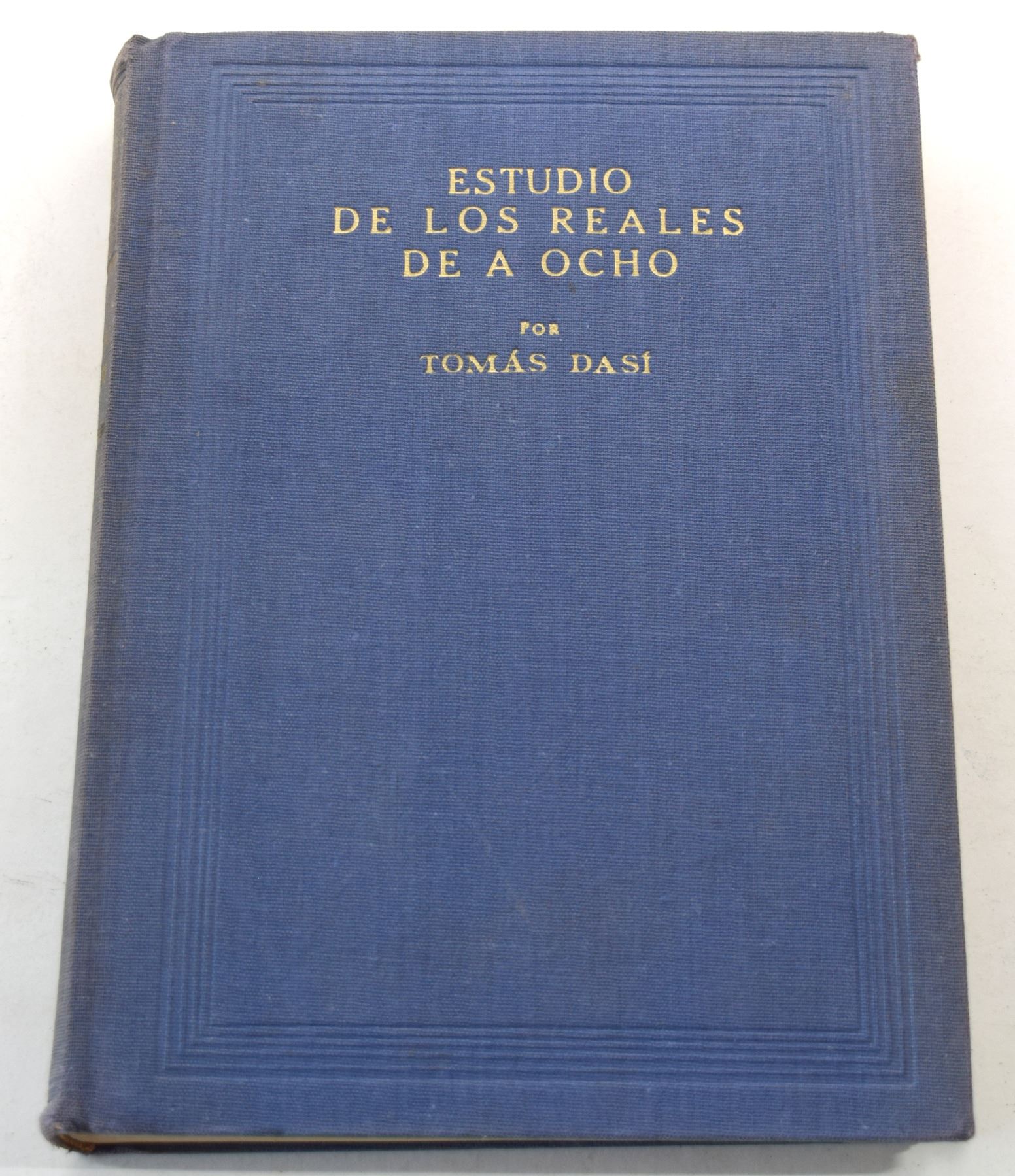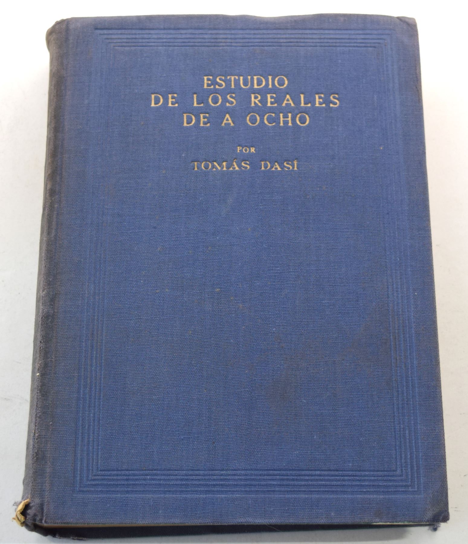 Dasí, Tomas. ESTUDIO DE LOS REALES DE A OCHO, VOLUMES 1 THROUGH 5. Tomas Dasí. 1950. 8vo, pages; Hardcover; Ex Kolbe June 9-15, 1984 sale lot 508; Five volumes, complete; original matching blue cloth, gilt. (I) limited edition 317 of 500 copies, 102 pages; (II) limited edition 323 of 500 copies, 232 pages; (III) limited edition 325 of 500 copies, 223 pages; (IV) limited edition 298 of 500 copies, 269 pages; (V) limited edition 318 of 500 copies, 159 pages; numerous text illustrations of coins. Some joints cracked, as often seen on these; ex libris stamps on endpapers. Very good. An indispensable reference to the 8 reales crowns of Spain and Colonial Spain. A notoriously fragile work, printed on inferior paper and poorly bound. Subject: Coinage - Spain