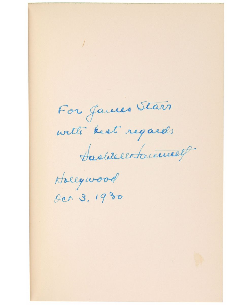 Signed book: Red Harvest. Second printing. NY: Alfred A. Knopf, 1930. Hardcover with a facsimile dust jacket, 5.5 x 7.75, 270 pages. Signed and inscribed on a free end page in fountain pen, “For James Starr, with best regards, Dashiell Hammett, Hollywood, Oct 3, 1930.” Autographic condition: fine, with a small spot of soiling to the lower right and a bit of feathering to ink. Book condition: VG/NF. Red Harvest was Hammett’s first novel and narrated by the Continental Op, a frequent detective character in his fiction. This is considered one of the greatest detective novels ever written, and books signed by Hammett are quite scarce, especially from this early point in his career.