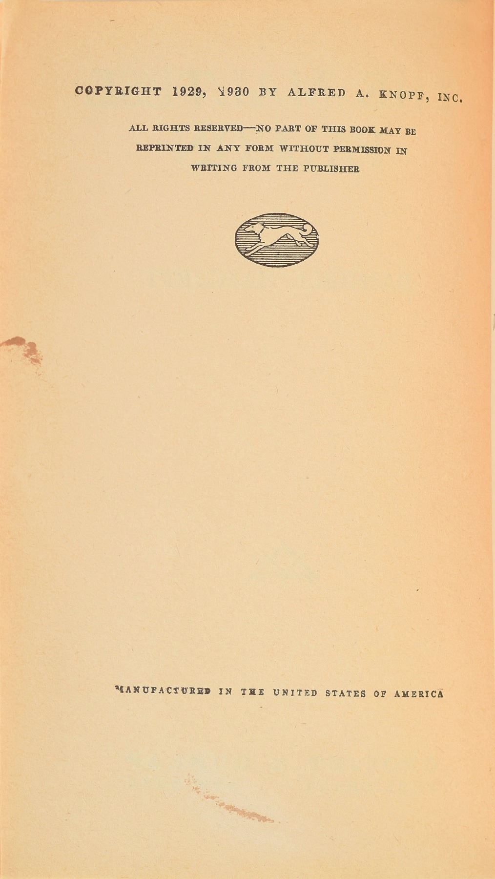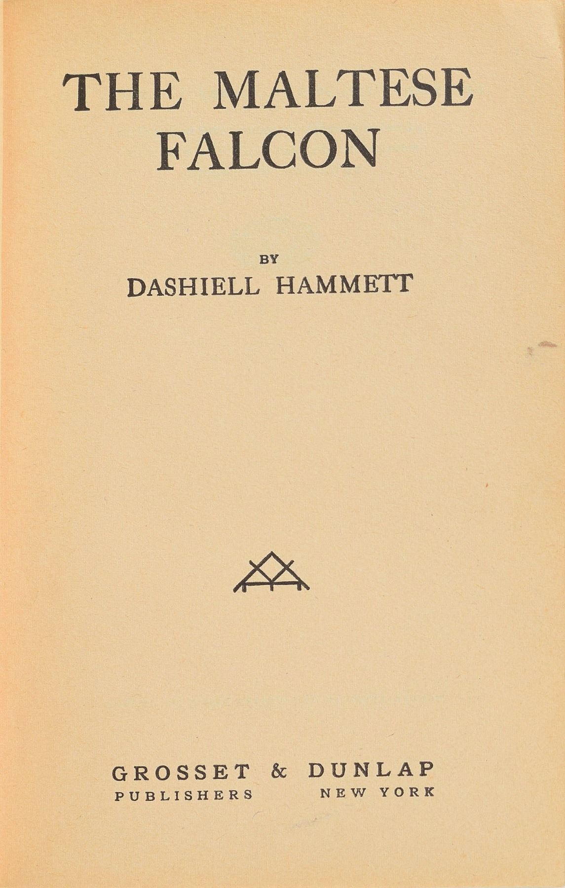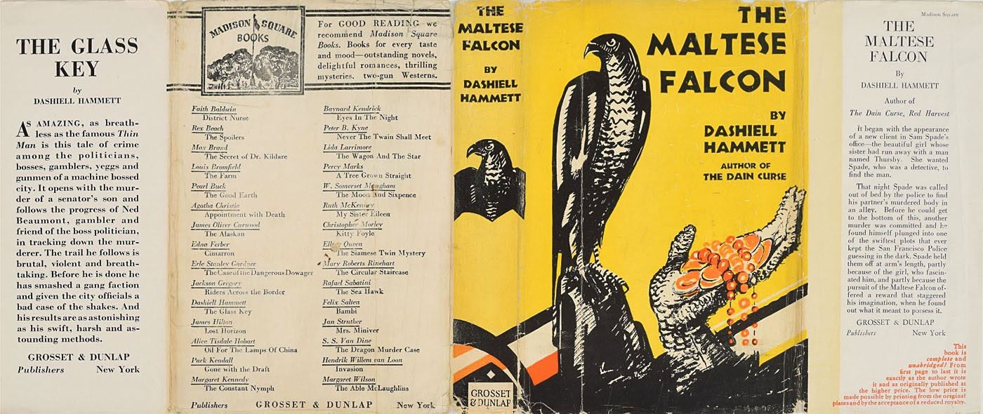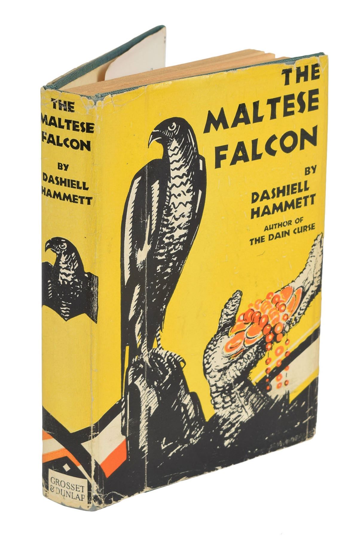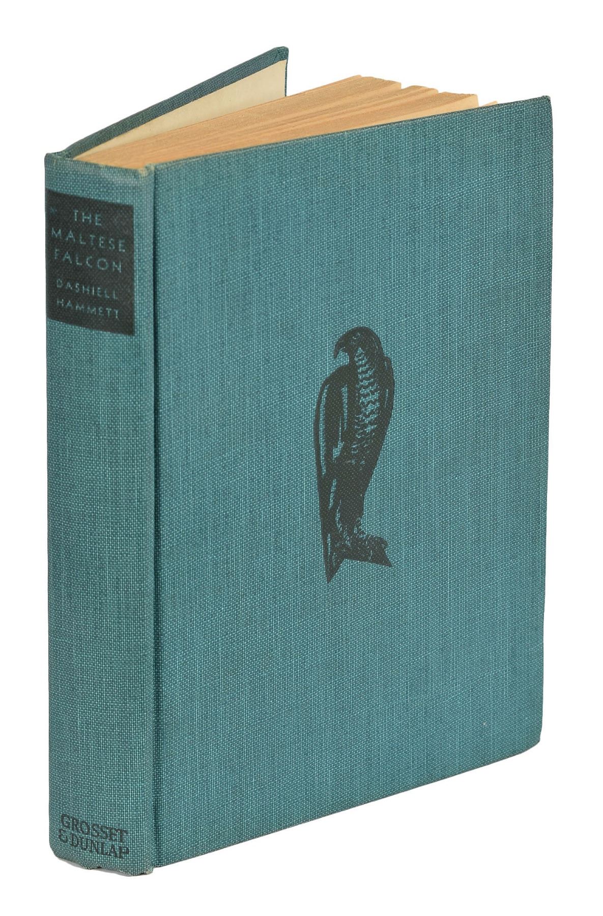 Desirable unsigned book: The Maltese Falcon. Later printing. NY: Grosset & Dunlap, 1930. Hardcover with dust jacket, 5.25 x 7.75, 267 pages. Book condition: VG/VG-, with heavy scattered creasing, vertical folds, and small edge nicks and tears to dust jacket. An appealing early Grosset reprint of Hammett's classic hard-boiled detective novel.