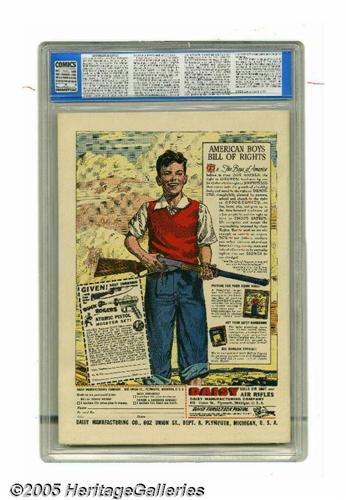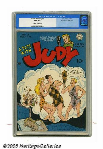 <B>Date With Judy, A #3 Mile High pedigree (DC, 1948) CGC NM+ 9.6 Off-white to white pages.</B></I> Teen character Judy Foster was a success in many media, starting in radio and continuing with a feature film, a TV show, and this comic series which ran for 13 years. Her blond boyfriend Oogie Pringle also appears on the cover, albeit with an uncharacteristic buzz cut. This is the only copy of this issue that CGC has certified as of this writing. Overstreet 2005 NM- 9.2 value = $110. CGC census 2/05: 1 in 9.6, none higher.