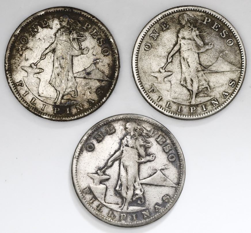 Date set of three Philippines (struck at the San Francisco Mint), pesos: 1907-S, 1908-S, and 1909-S.