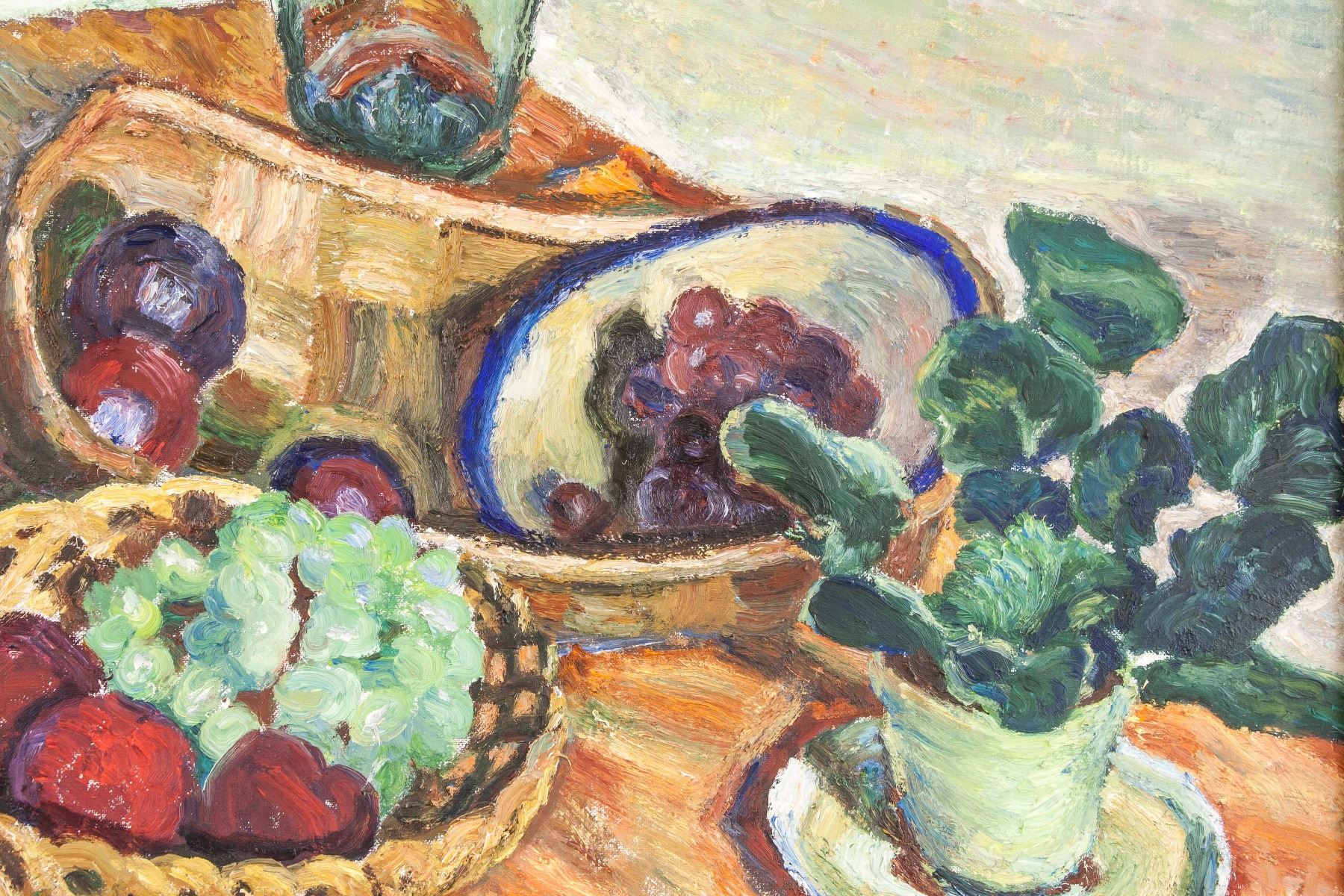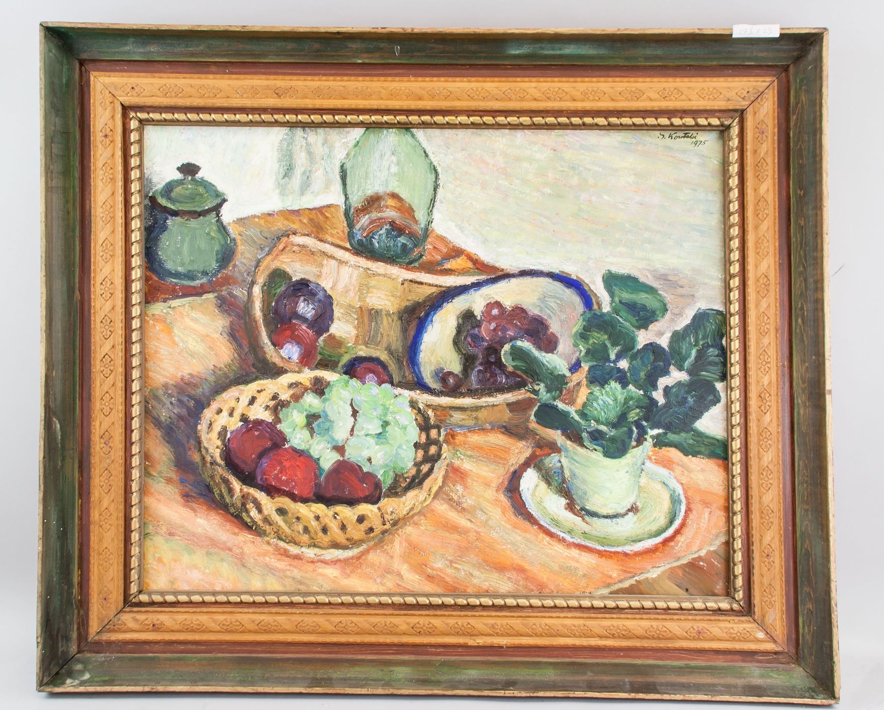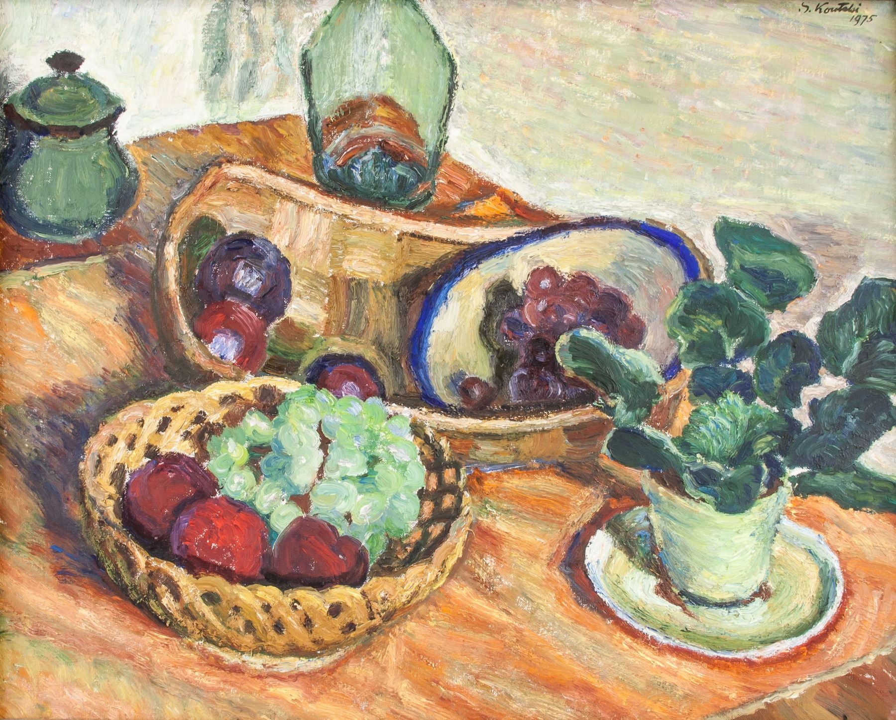 Oil on canvas painting, featuring still of vases, baskets, and fruits. Signed on upper right corner and dated 1975. 18.5 x 23 in (47.0 x 58.4 cm). PROVENANCE: Private collection, Montreal, QC