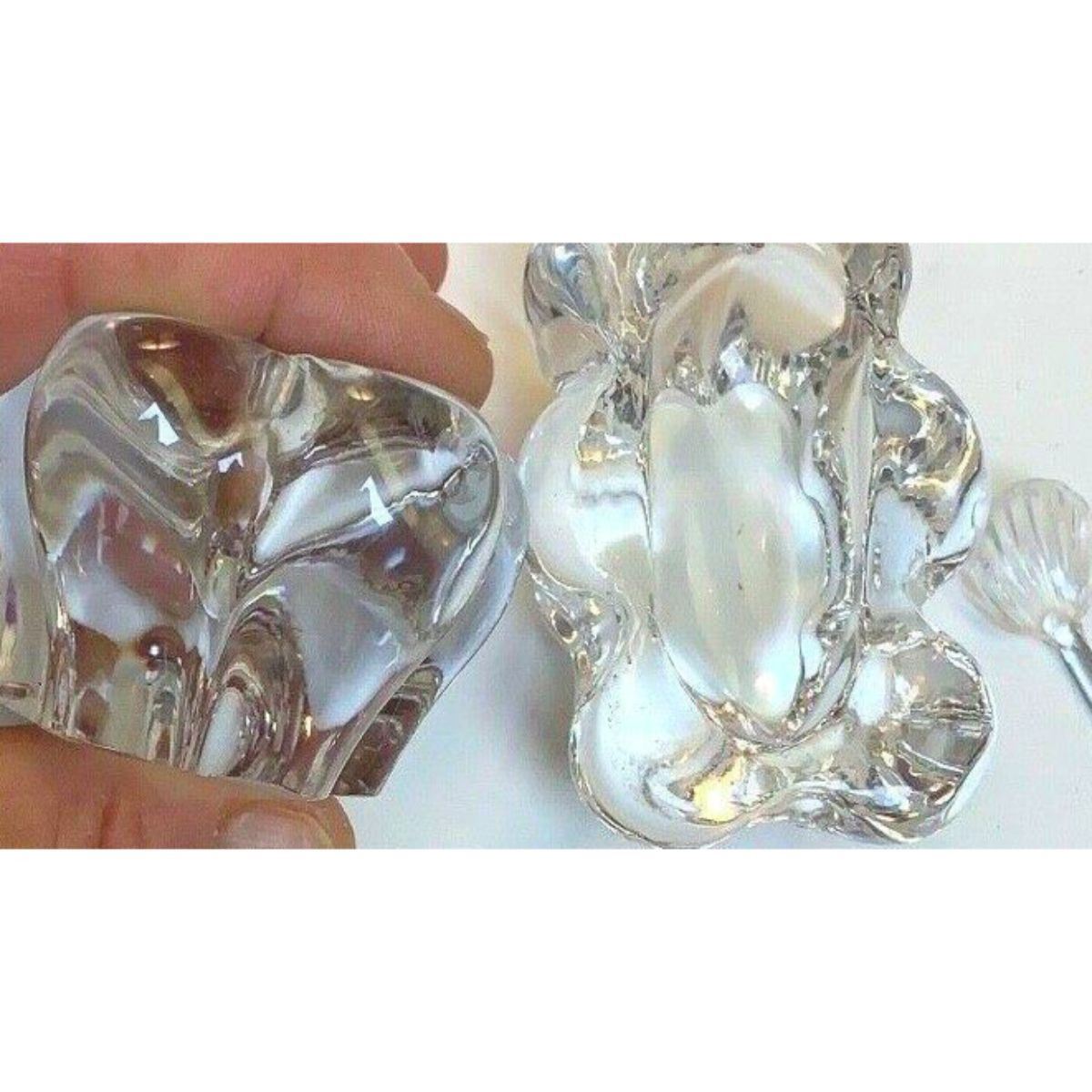 Pair of dainty but heavy signed Daum France floral form clear crystal salts, salt cellars with spoon. Â 2" L XÂ 2 3/4" W X 1 1/2" H.