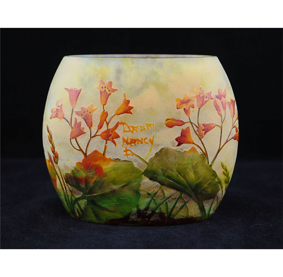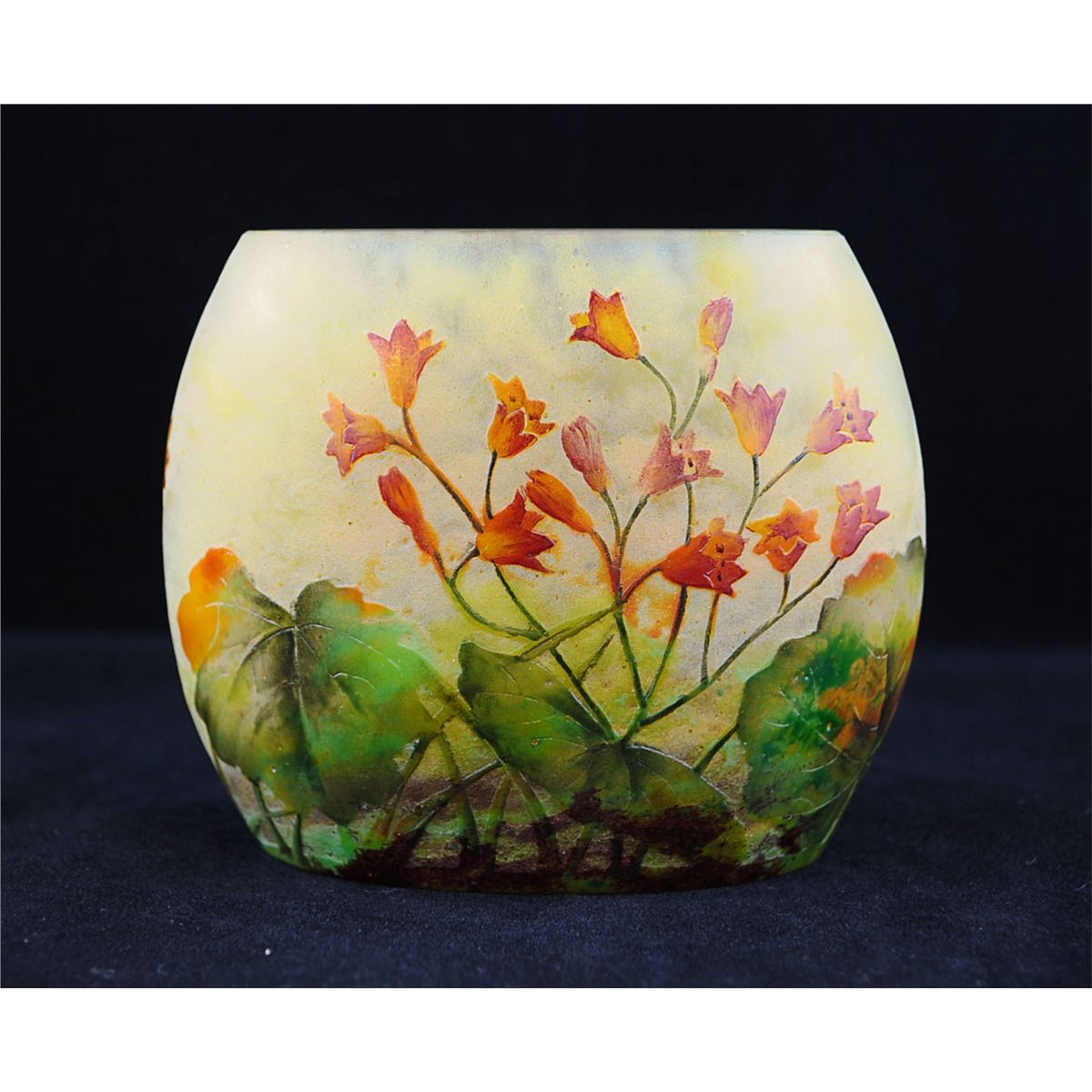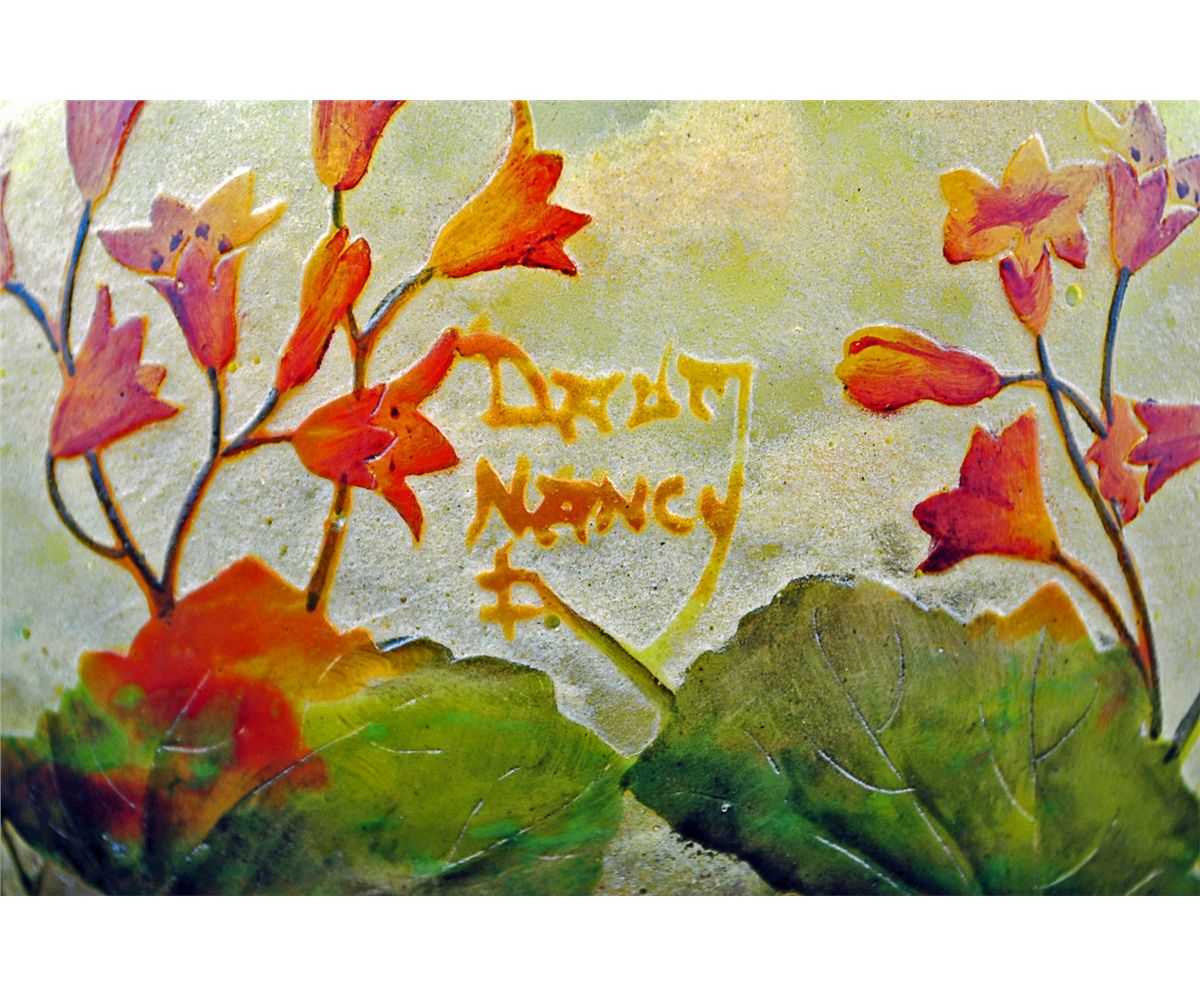 Daum Nancy cameo glass pillow vase, yellow glass overlaid with cameo in shades of green and red with green leafy stemmed branches. Signed in cameo, "Daum Nancy with Cross of Lorraine". 3.12"H X 3.75" W., Circa - 1890-1925.;Vase is in wonderful condition and free of chips cracks or damage.