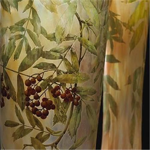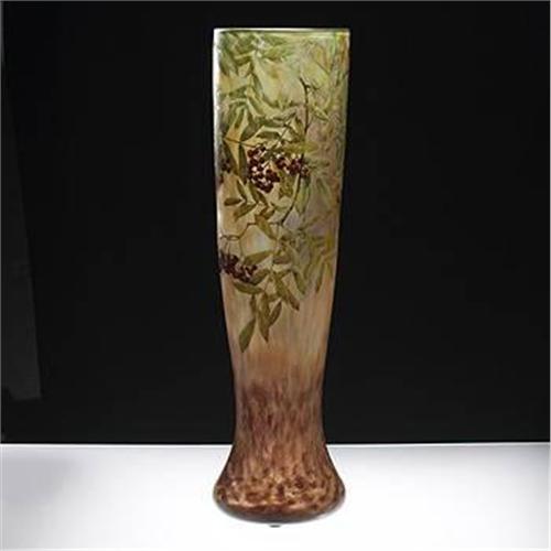 Daum Nancy vase France, c. 1905 etched and enameled glass 5.75 dia x 24 h inches Etched signature to side: [Daum Nancy 3501] with the cross of Lorraine.