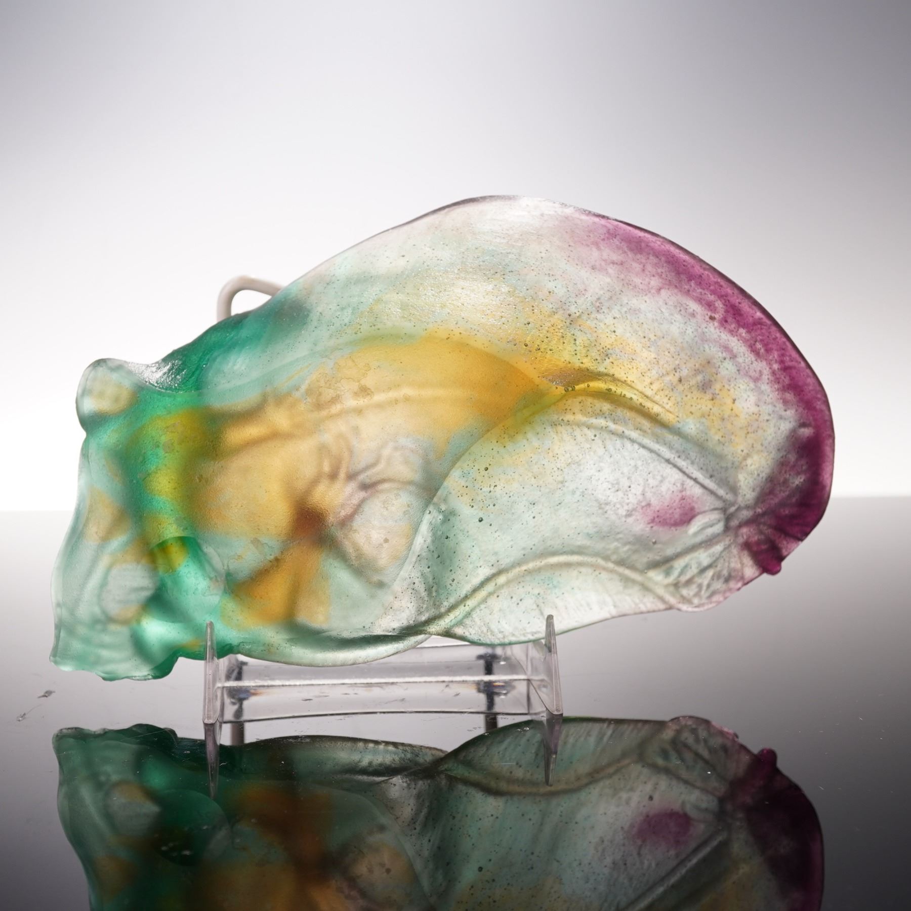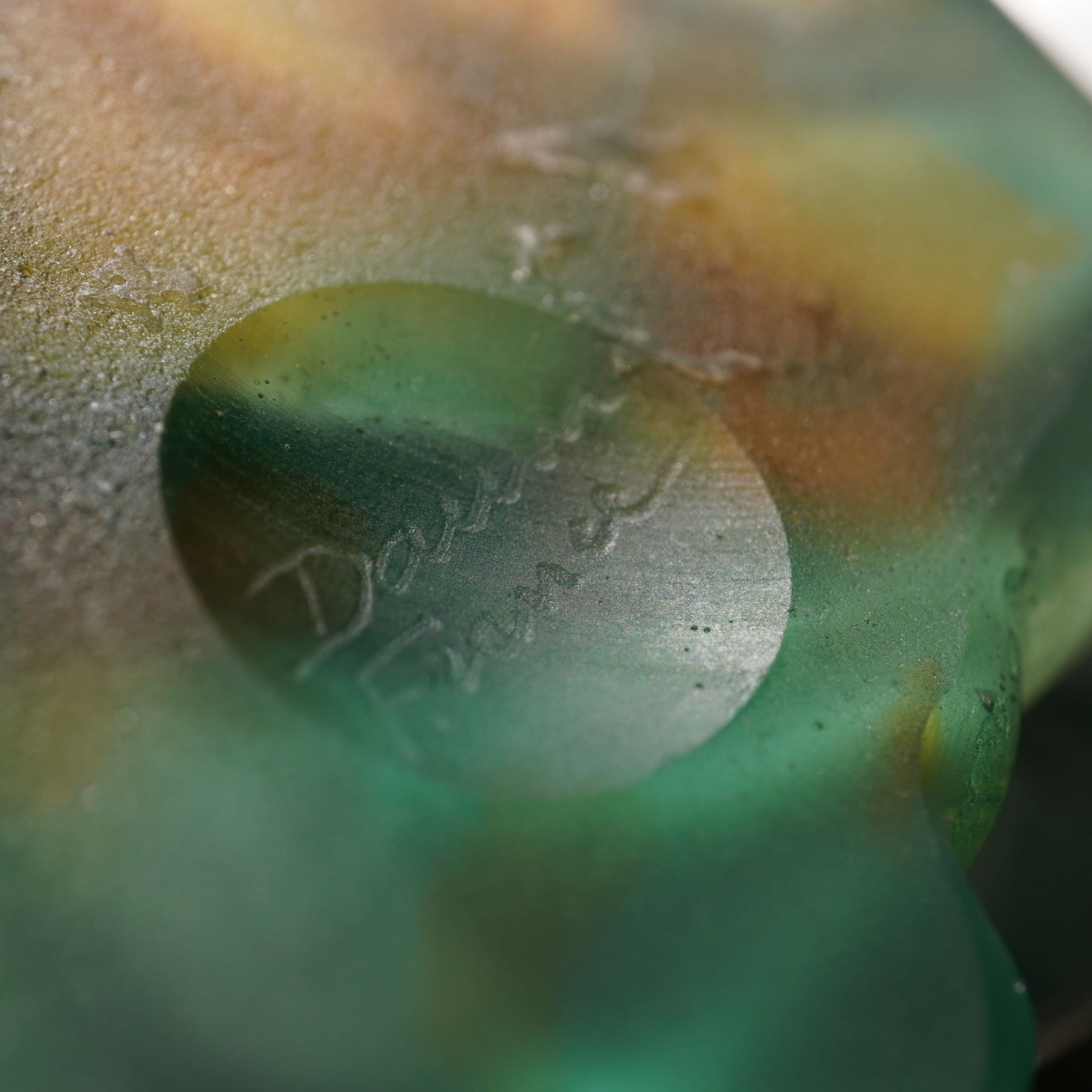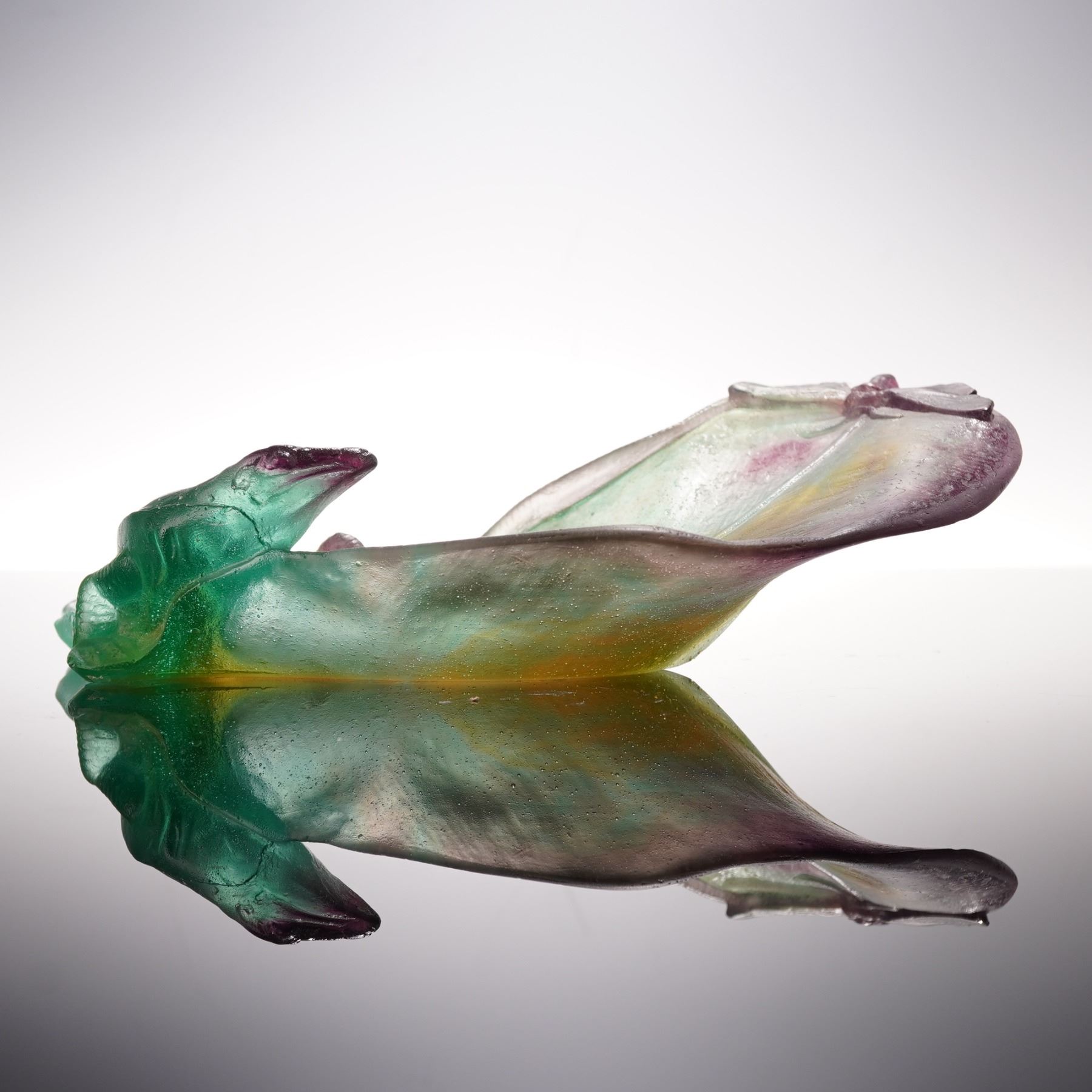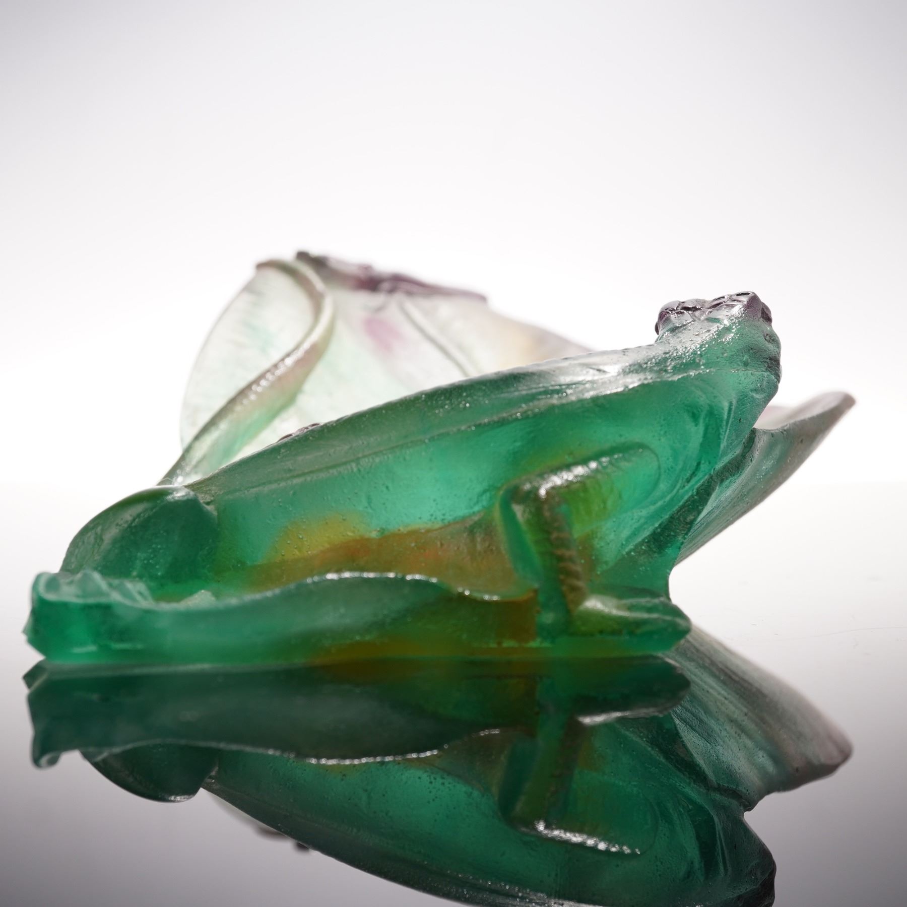 This Daum tray captures the delicate harmony of nature through softly blended translucent colors of green, amber, and violet. A lizard rests along the curved edge, its limbs and tail following the organic flow of the form, while a butterfly nestles at the opposite side. The surface reveals subtle textural details that catch and diffuse the light, enhancing the lifelike movement within the piece. Graceful and fluid in composition, it reflects Daum's mastery of artistry and natural inspiration. Daum France backstamp.
