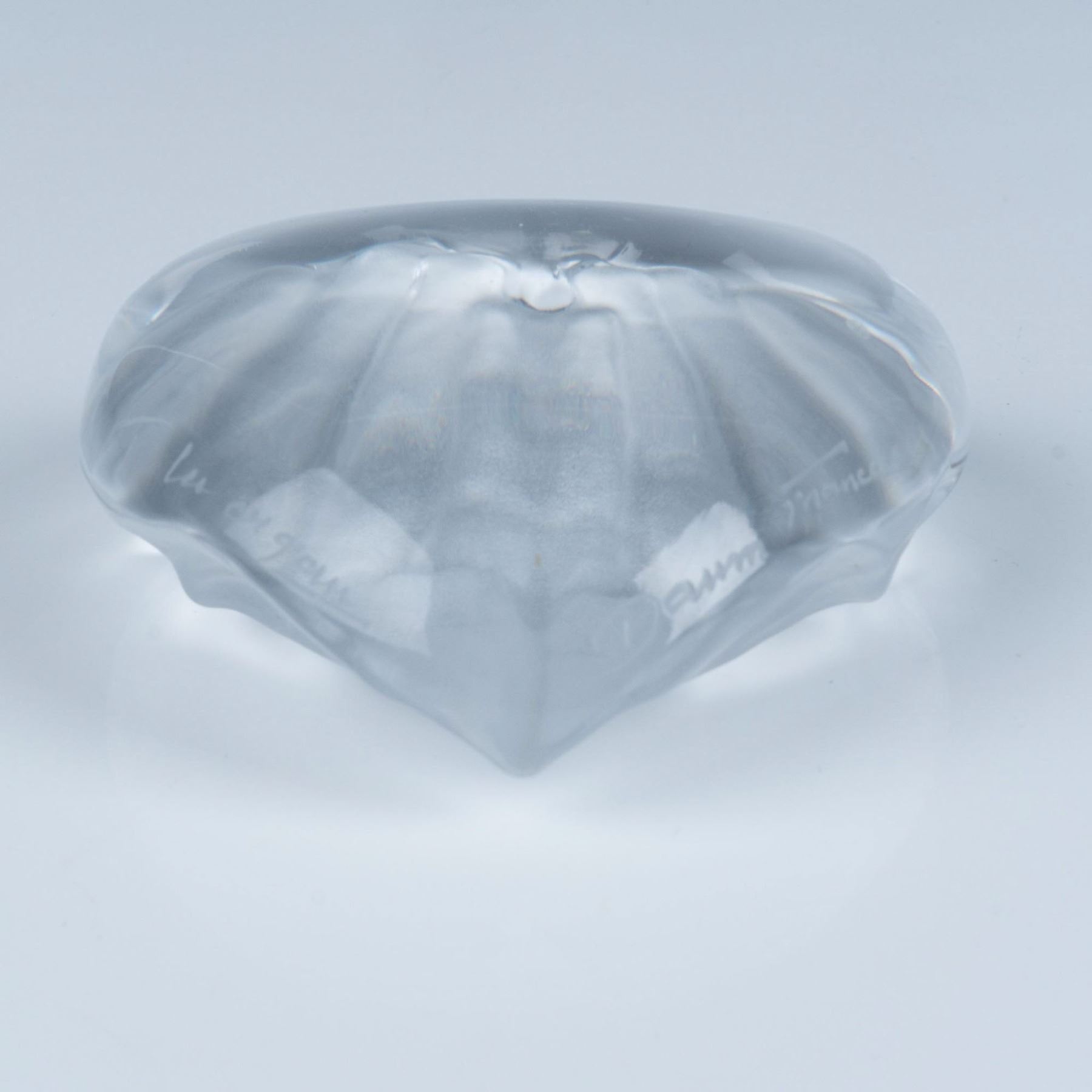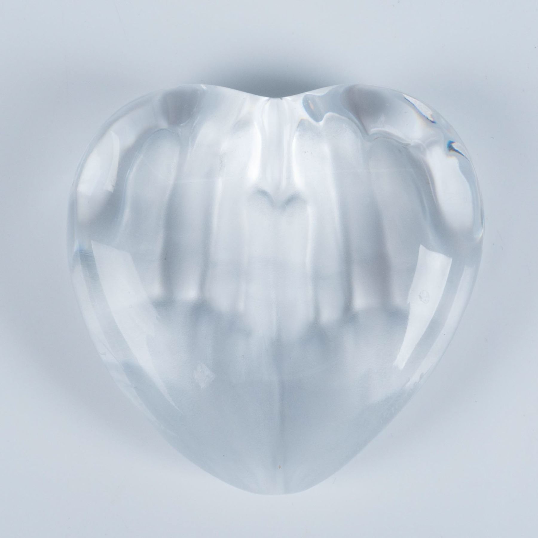 French glass paperweight with heart form and frosted pressed hand reliefs. Daum France, and artist name engraved on the sides.