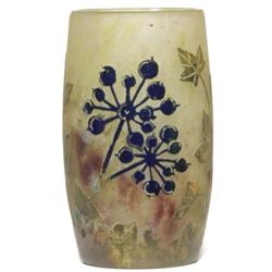 Nice Daum vase, unusual cameo design of leaves and berries against a mottled yellow and red ground, cameo signature, 3.5”h