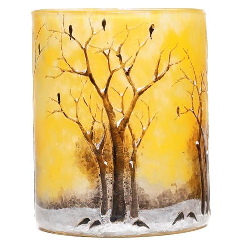 Rare Daum vase, cylindrical form with a detailed cameo and enameled design of snow covered trees and birds against a mottled yellow ground, signed,3.5in.h